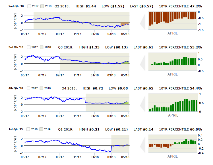 Dairy margins improved slightly over the last half of April as increased milk prices more than offset the impact of rising feed costs. While margins are still only about average from a historical perspective, with the exception of spot Q2, they are projected positive into early 2019. Milk prices are drawing support from a delayed spring flush following unseasonably cold weather in the Upper Midwest while a recent surge in NDM prices has lifted Class IV Milk futures on the CME. USDA reported March Milk Production at 18.987 billion pounds, up 1.3% from last year, with the milking herd estimated at 9.406 million head, down 2,000 from February but 23,000 higher than March, 2017. Production per cow averaged 1,954 lbs. in March, up 1.1% from last year. Meanwhile, USDA Cold Storage data reflected more modest builds in dairy inventories than would seasonally be expected. Butter stocks in cold storage at the end of March totaled 273.6 million pounds, up 2.9% from February and 0.4% higher than last year. The February to March build in supply slightly trailed the 3.8% average based on the past ten years. Total cheese in cold storage on March 31 was 1.328 billion pounds, up 0.8% from February compared to the average build of 1.6% between February and March over the past ten years. Total cheese stocks were also up 5.2% from March, 2017. Feed costs have continued to advance on strong demand amidst ongoing planting delays. USDA reported corn planting progress for the week ending April 29 at 17% complete compared to 32% last year and 30% on average for the end of April over the past 10 years. Soybean planting progress was reported at 5% complete versus 9% last year and 6% on average for this point in the season. Our clients have been mainly focused on strategic adjustments to existing positions, including allocation of milk hedges between Class III and Class IV, and adding flexibility to feed hedges.