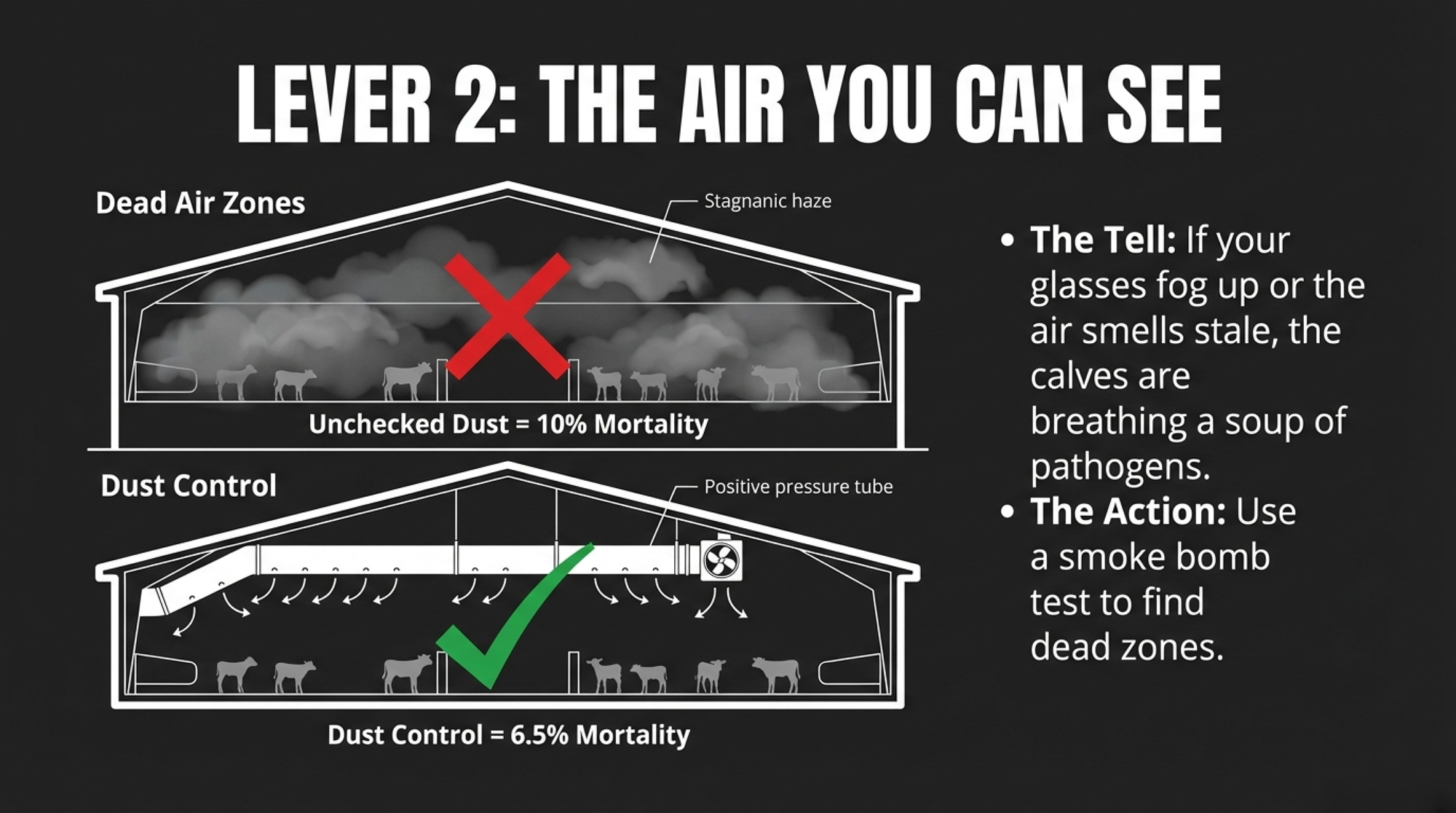 - The “tell” is simple: if it smells stale, looks dusty, or your glasses fog up when walking in, calves are breathing that too.