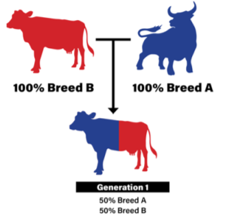 While this 1985 definition of the minimum standard for purebred status is helpful, it is now possible to use DNA genotypes to be more precise in measuring an animal’s breed purity. In the United States, as part of its routine genetic evaluation services the Council for Dairy Cattle Breeding (CDCB) also publishes a value for each animal referred to as the Breed Base Representation (BBR). The BBR was introduced to provide the means for calculating genomic evaluations for genotyped crossbred animals. The basis of the BBR calculation is a specific set of genetic markers (i.e.: SNP) that were found to be unique to known multi‐generational purebred animals within each breed. Using these markers, CDCB can estimate how much of an animal’s DNA is from each of the main breeds of cattle, which therefore defines their breed composition. By chance, an animal with known purebred ancestry may have a calculated BBR as low as 94%. Considering this potential range in calculated BBR values, the CDCB considers animals with a BBR of 94% or higher as purebred and therefore do not treat them as crossbred animals for the calculation and publication of genomic evaluations. As shown in the sidebar diagram, after the first mating of two animals from different breeds, which results in a breed purity level of 50%, three more generations of mating back a purebred sire of the foundation breed results in offspring that have a breed purity level of 93.75%. Using the “purebred” policy in United States as a guiding principle, offspring resulting from five or more generations of mating back to purebred sires would be considered as purebreds.