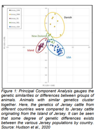 However, the differences observed in Figure 1 are relatively small compared to the differences between all Jersey animals, both Island and international, and other cattle breeds. In Figure 2, we see that Jersey animals cluster together and that large genetic differences clearly exist between the Jersey populations and cattle of other breeds. So, while the international Jerseys are not genetically identical to their Island ancestors, they contain much more similar genetic structures than that of other breeds.