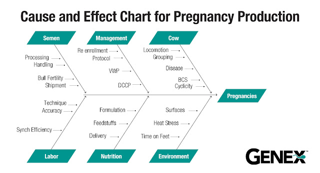 1) Percent pregnant by 150 Days in Milk (DIM). It seems many of the herds we work with have exceeded the goal of 75% that we were looking at a few years ago. Confirming this, our Dairy Performance Navigator system shows the top 10% of herds by milk production out of 280 Holstein herds, each with over 500 cows, now average 81% of the herd pregnant by 150 DIM. GENEX Excellence in Reproduction Award winners for 2017 averaged 88% pregnant by 150 DIM. A new goal of >80% of cows pregnant by 150 DIM seems appropriate now.2) 3-week pregnancy rate. Depending on the program your farm uses, the calculation of cows that are eligible to be bred may vary. Ultimately, the pregnancy rate is driven by conception rates and service rates. Factors that diminish estrus expression or detection or reduce conception will reduce the pregnancy rate. Many factors that affect reproductive success are shown below.