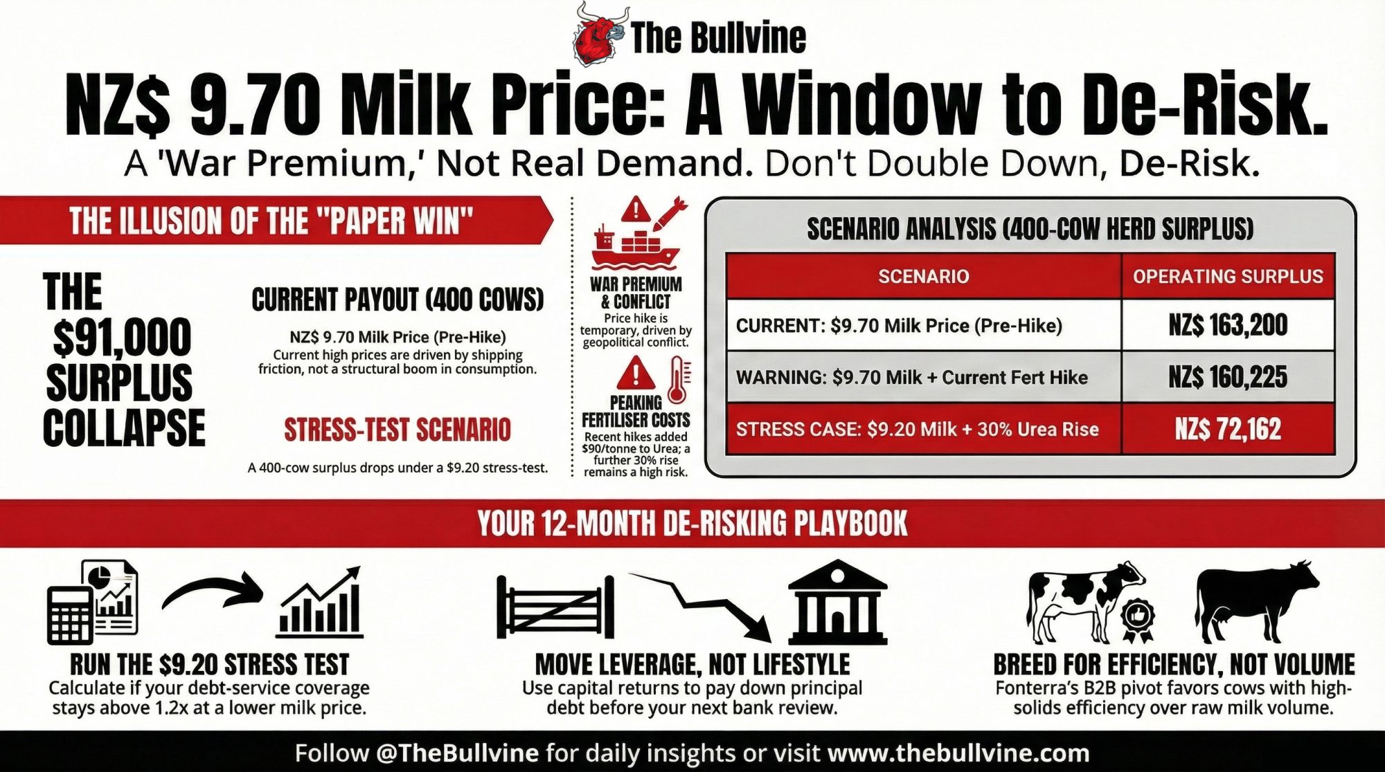 Executive Summary: Fonterra’s NZ$9.70/kgMS midpoint looks like a win, but ANZ already pegs 2026/27 closer to NZ$8.70, and Ballance just added NZ$90/t to urea. A 400‑cow herd that appears to clear NZ$163,200 at NZ$9.70 and DairyNZ’s NZ$8.68 breakeven can see that surplus collapse to about NZ$72,000 if milk slips to NZ$9.20 and nitrogen climbs another 30%. The co‑op has hedged itself with a 10‑year raw milk deal, a 3‑year ingredients agreement, and roughly NZ$3.9B in returns, but none of that changes your breakeven, leverage, or debt‑service coverage. This piece walks through the barn math step‑by‑step so you can plug in your own kgMS, fert tonnes, and debt schedule. It shows why herds in the 60–65% debt‑to‑asset band are in a “use this payout to de‑risk or double down” 12‑month window. And it lays out a practical playbook: how to stress‑test at NZ$9.20 plus higher fert, what to take to your next bank review, and how to decide whether to lock in nitrogen or ride the market.