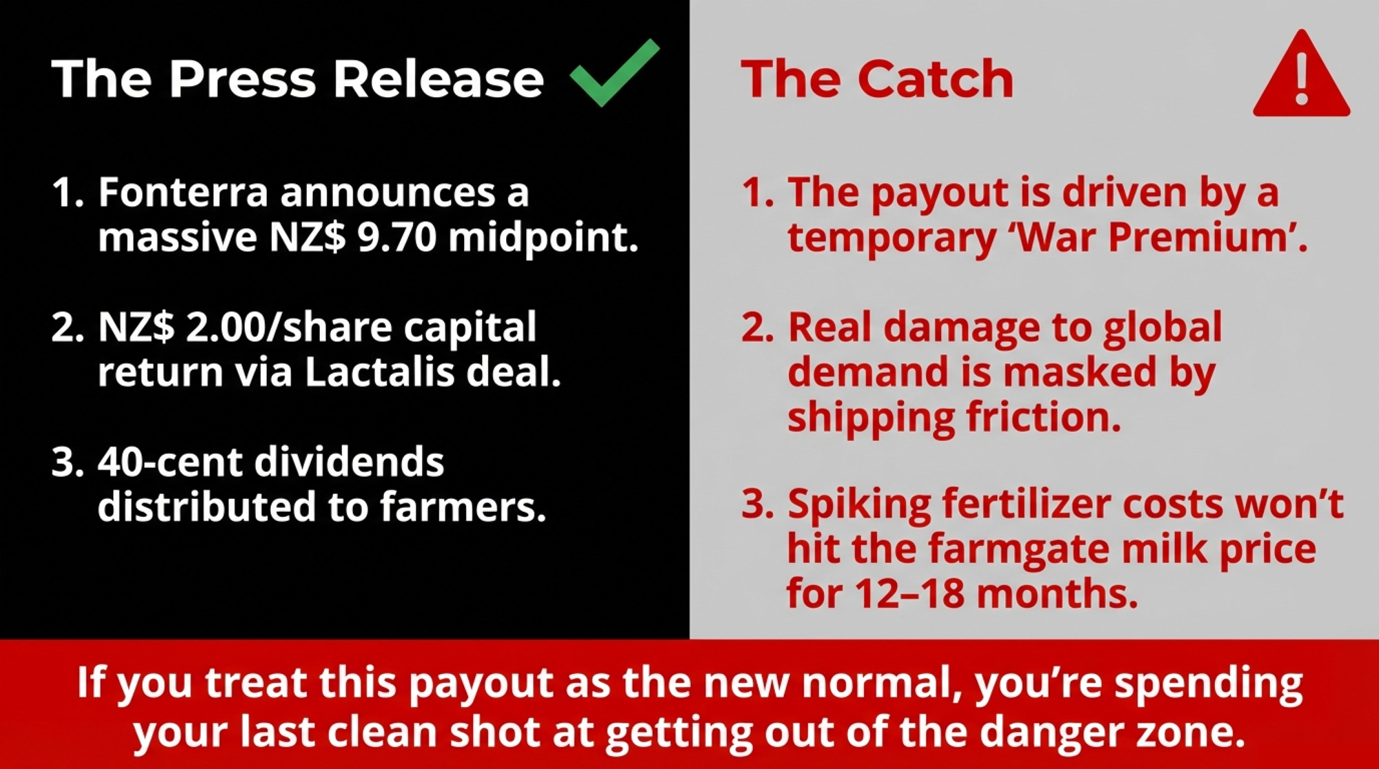 The catch is simple and uncomfortable: those record numbers are boosted by short‑term conflict and shipping friction, while the real damage to demand and fertiliser costs won’t show up in the farmgate milk price for another 12–18 months. If you treat this payout as the new normal, you may be spending what should’ve been your last clean shot at moving out of the danger band — not because the numbers are wrong, but because the conditions behind them may not last.
