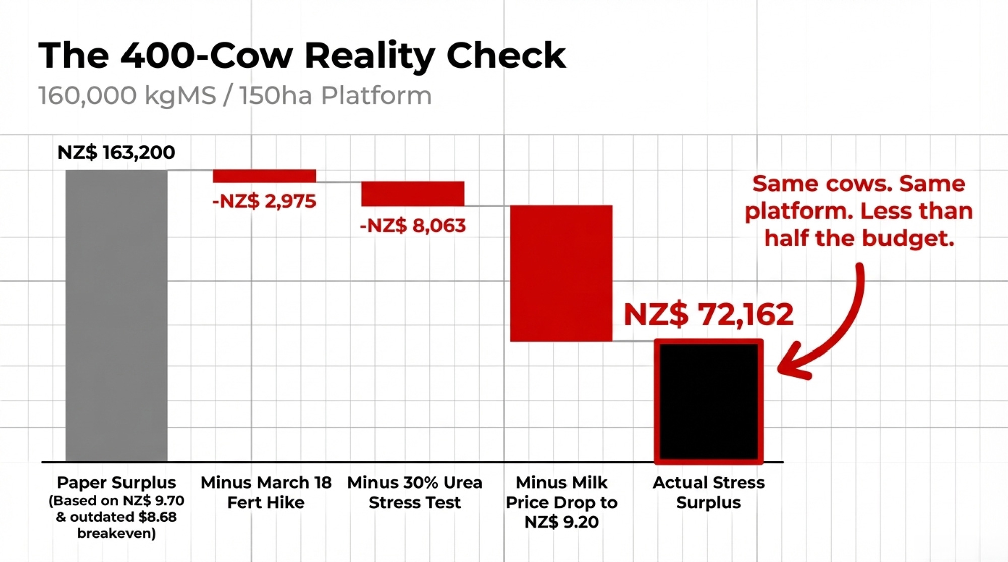 At NZ$9.70, a 400‑cow herd clears NZ$163,200. At NZ$9.20 with post‑March fert costs, it’s NZ$72,162. Same cows. Same platform. Different budget.