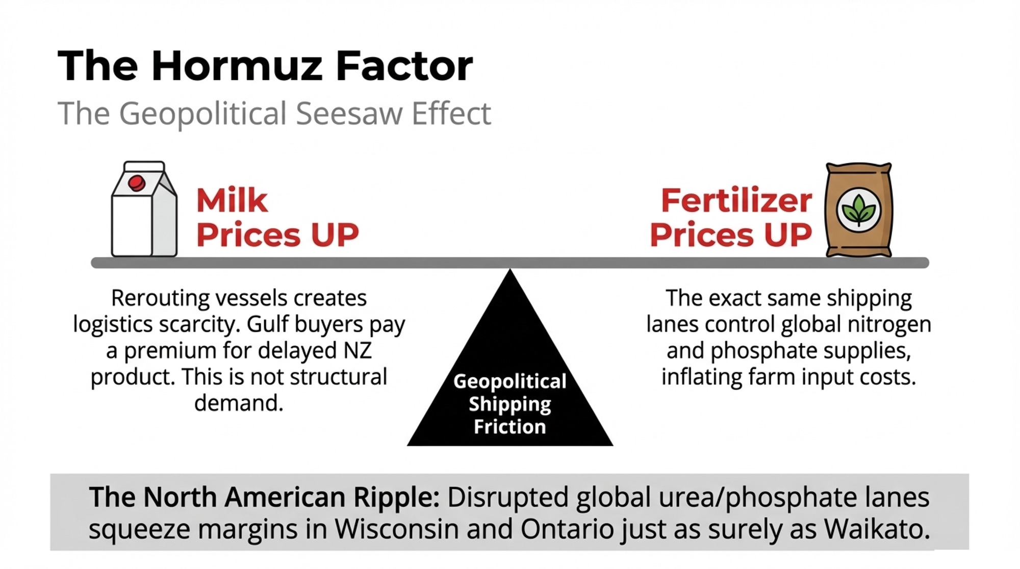That’s the real “Hormuz Factor.” It’s not just an NZ shipping problem — it’s a global nitrogen and energy problem that puts pressure on Midwestern and Canadian fertiliser and feed costs in a different but still serious way. If fertiliser prices grind higher while crop prices don’t move in step — a risk several analysts are flagging under a prolonged Hormuz disruption — margins get squeezed in Wisconsin and Ontario just as surely as they do in Waikato, even if the exact numbers differ.