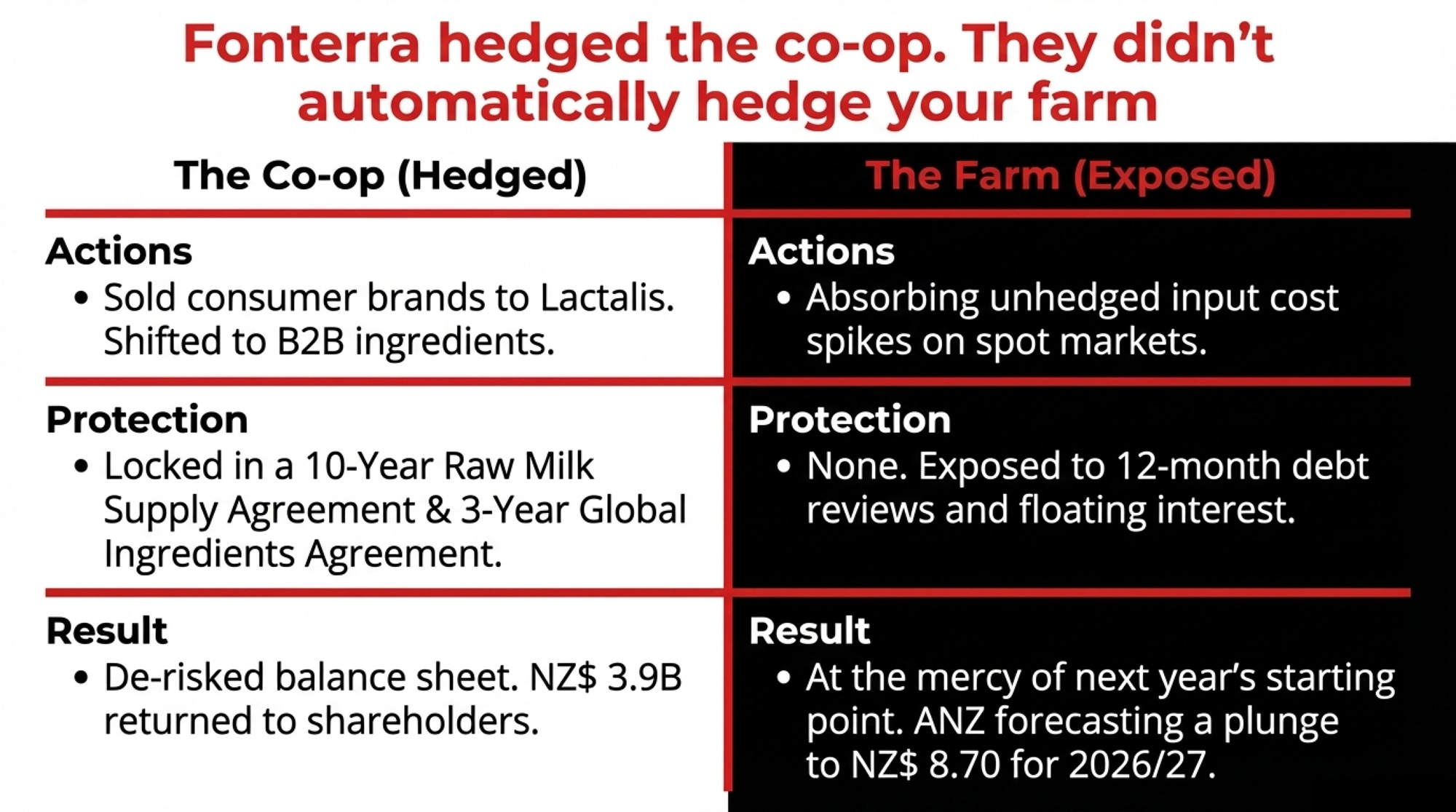 - The Lactalis deal gives Fonterra long‑term supply security — a 10‑year RMSA and a 3‑year GSA, both auto‑renewing with 36‑month notice. That hedges the co‑op’s risk. It does not hedge your farm’s breakeven or leverage.