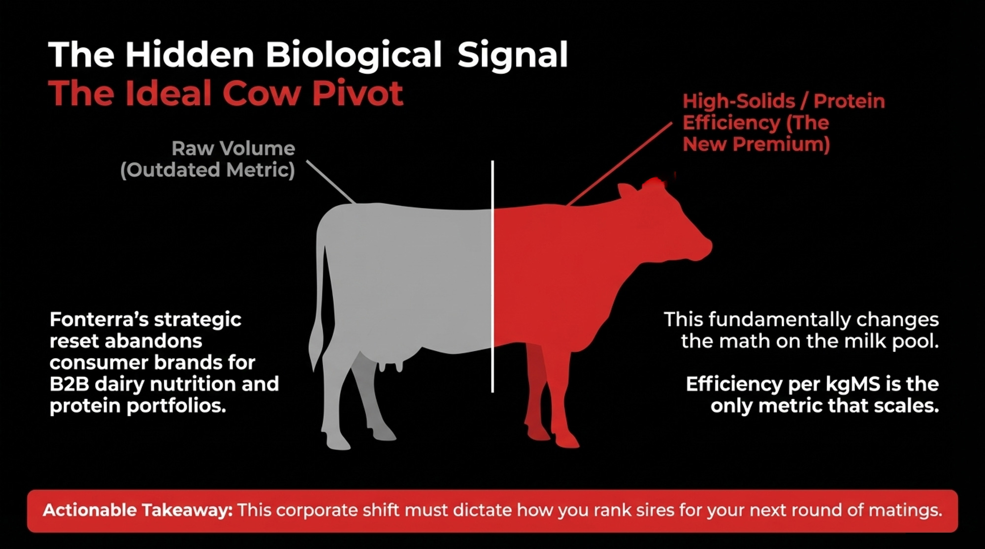 If you think in terms of genetics rather than just cheques, this pivot matters. Fonterra’s growth talk now leans heavily into “higher‑value ingredients and nutrition solutions,” with strong earnings contributions from its protein portfolio and Foodservice channels. That naturally pushes the ideal New Zealand cow further toward high solids and efficiency per kgMS, not just raw volume — which is how many genetics‑focused suppliers are reading the signal as they rank sires for the Fonterra milk pool.