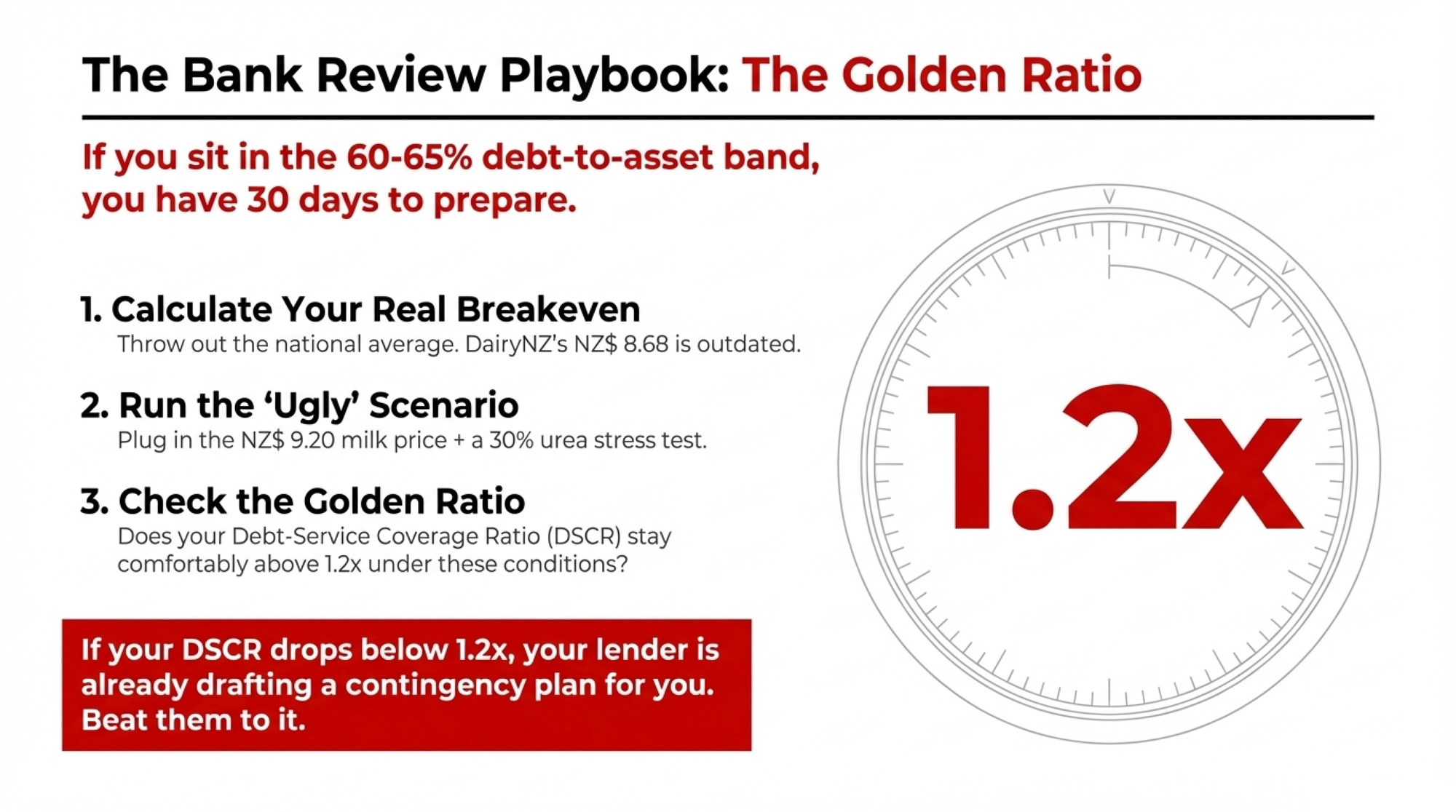 - In the next 30 days, before your bank review, do one thing: put your actual breakeven per kgMS and your fertiliser‑adjusted budget next to a NZ$9.20 milk price on a single sheet of paper. That’s the forecast the bank will stress‑test you against, whether they say it aloud or not.