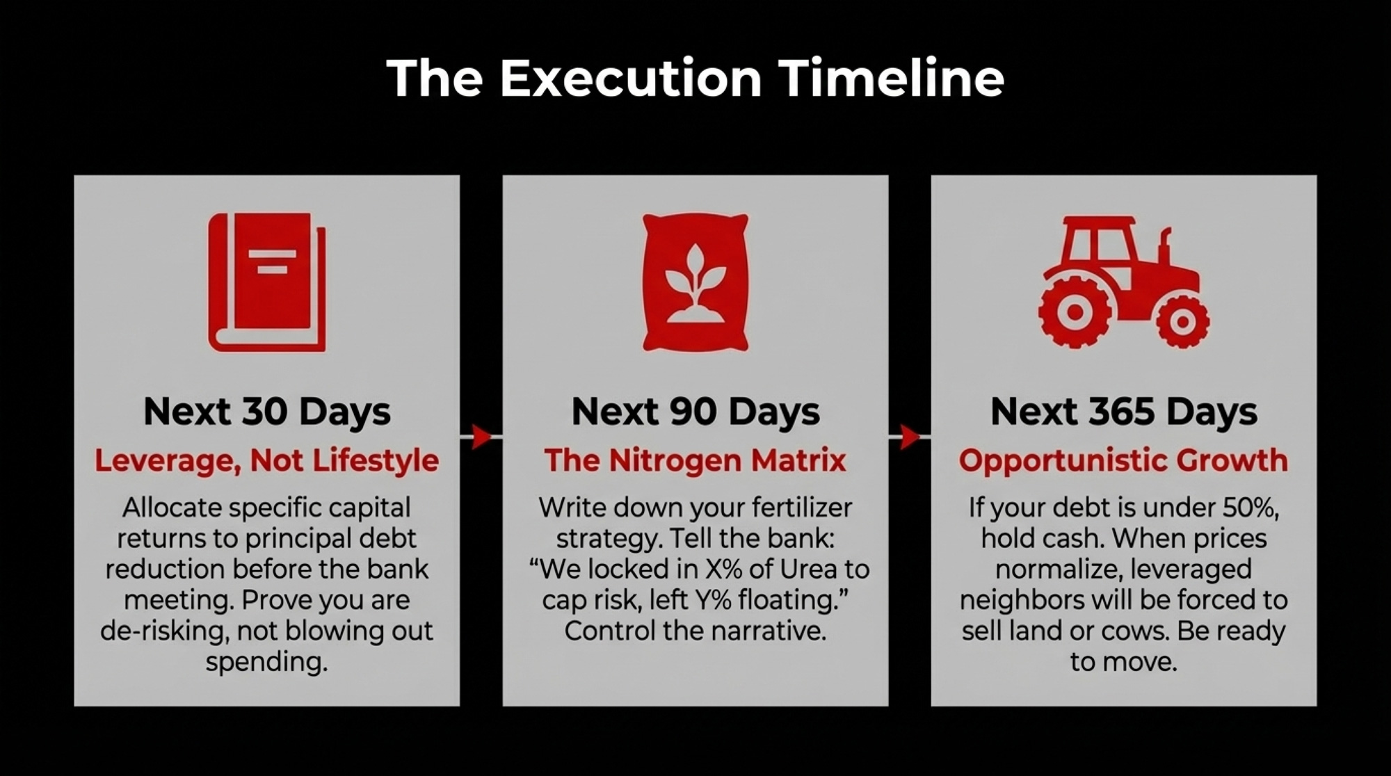 | 50–60% | 🟡 Moderate | Lock in portion of urea; document fert strategy for bank | Any urea +30% scenario that erodes DSCR |