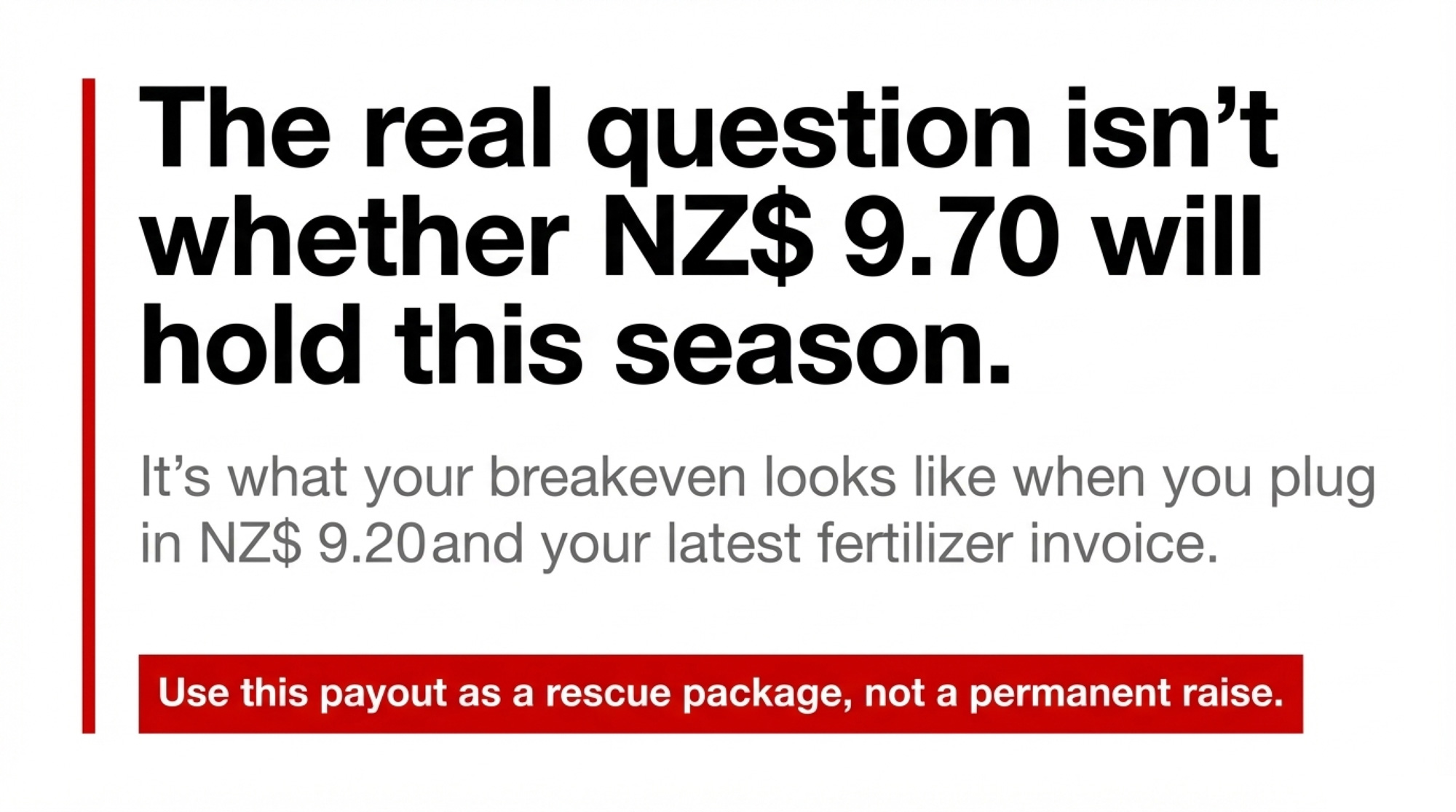 Make yourself a habit: once a year, before major spending decisions, run a “NZ$9.20 plus fertiliser stress test” on your numbers.