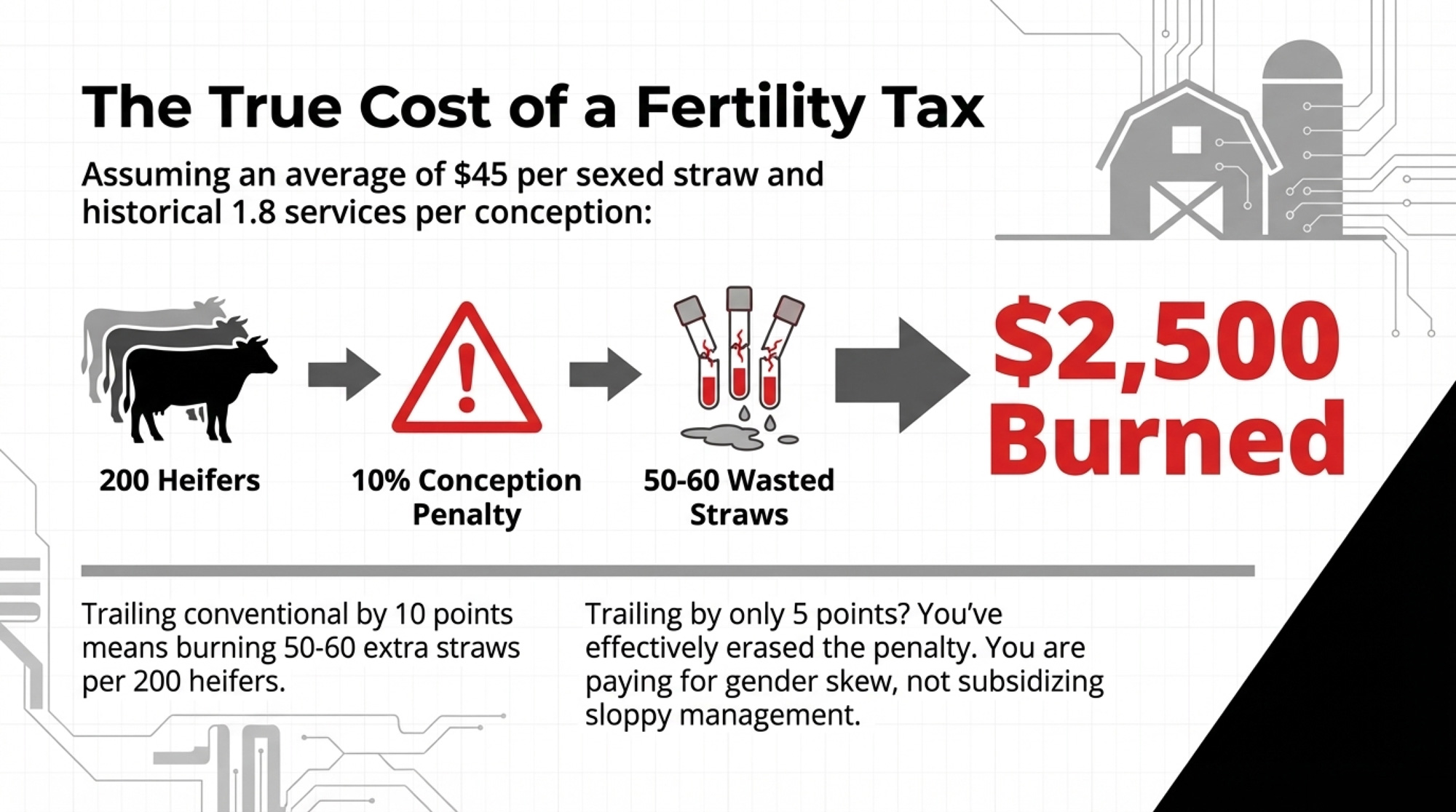 If sexed semen in your herd runs 10 points behind conventional, you’re burning 50–60 extra straws and $2,250–2,700on that 200-head cohort — plus the knock-on cost of extra days open, more rebreeds, and a slower heifer pipeline. If it’s running within about 5 points? You’ve mostly erased that old penalty. You’re paying for gender skew and flexibility, not subsidizing a fertility tax.