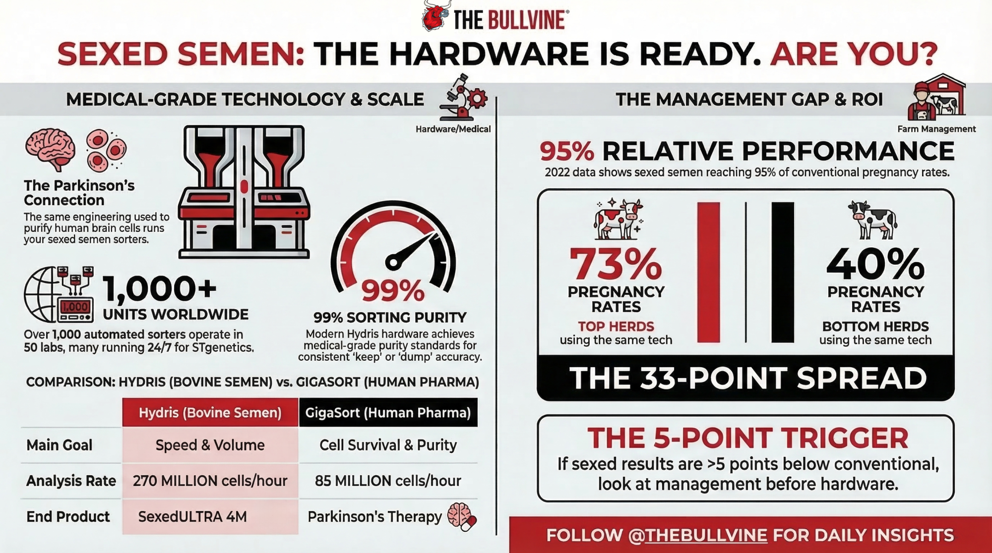 Executive Summary: Japan approved the world’s first iPS cell therapy for Parkinson’s disease on March 6, 2026. The sorter that purified those cells for human brains was built by Cytonome-ST — a subsidiary of STgenetics — and its sibling platform, Hydris SuperGen, now runs over 1,000 units across 50 labs, sorting every SexedULTRA 4M straw ST and its licensees sell. The hardware story has shifted fast: Ireland’s ICBF reports sexed semen at 95% of conventional pregnancy rates in 2022 commercial inseminations, up from 84% in earlier rounds. But the sharper stat is the 33-point spread between top herds (73% CR) and bottom herds (40%) — same technology, same country, gap driven almost entirely by management. For producers loading SexedULTRA 4M or genderSELECTed straws, the sorting machine is no longer the weak link in the chain. Your records — not the hardware — now hold the answer to whether you’re capturing what this technology can deliver.