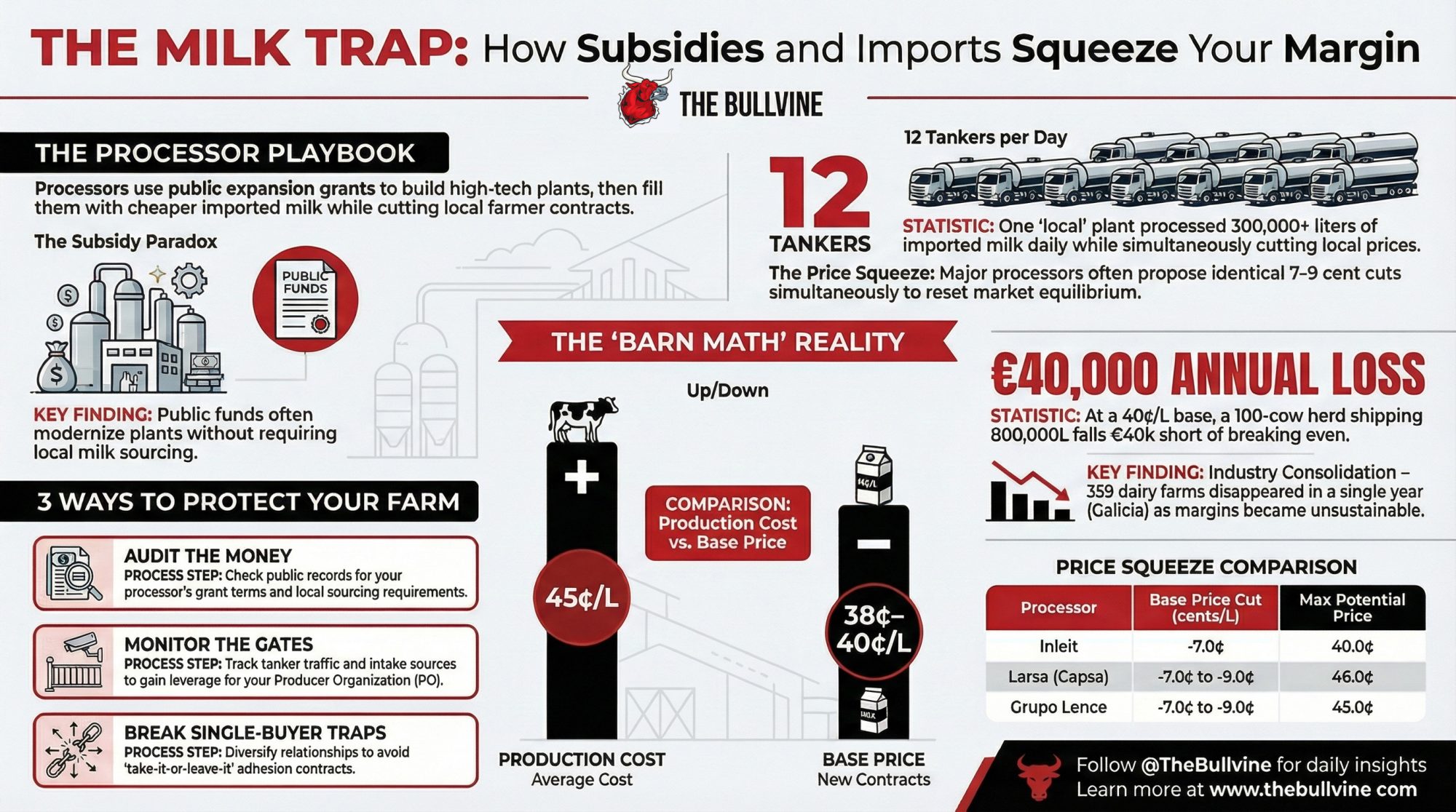 Executive Summary: Galician farmers proved their processor took €14 million in public subsidies, then filled a “local” plant with 12 Portuguese milk tankers a day and still tried to cut contracts 7–9 cents per litre. At Inleit’s proposed 40¢/L base, a 100‑cow herd shipping 800,000 L a year is roughly €40,000 under water against a 45¢/L cost of production, and other big processors in the region landed on almost identical cut ranges. Spain’s Food Chain Law technically bans below‑cost contracts, but AICA’s fines have been tiny, and courts have thrown out sanctions against buyers like Mercadona and Lactalis on procedural grounds, even as a Barcelona court ordered Capsa, Puleva, and Danone to compensate farmers 2% for a proven 2000–2013 milk cartel. The same playbook shows up in North America when subsidized plant expansions, FMMO make‑allowance changes, and TRQ usage quietly move hundreds of millions from the milk pool to processors without an obvious “price cut” on your statement. The article walks through simple checks you can run in 30 days — pulling your processor’s grant files, watching tanker traffic, stress‑testing your breakeven against current offers, and figuring out how exposed you are to a single buyer. If you’re wondering whether your own “local” plant is using foreign milk and regulatory tweaks to set up the next contract squeeze, this is worth a full read.