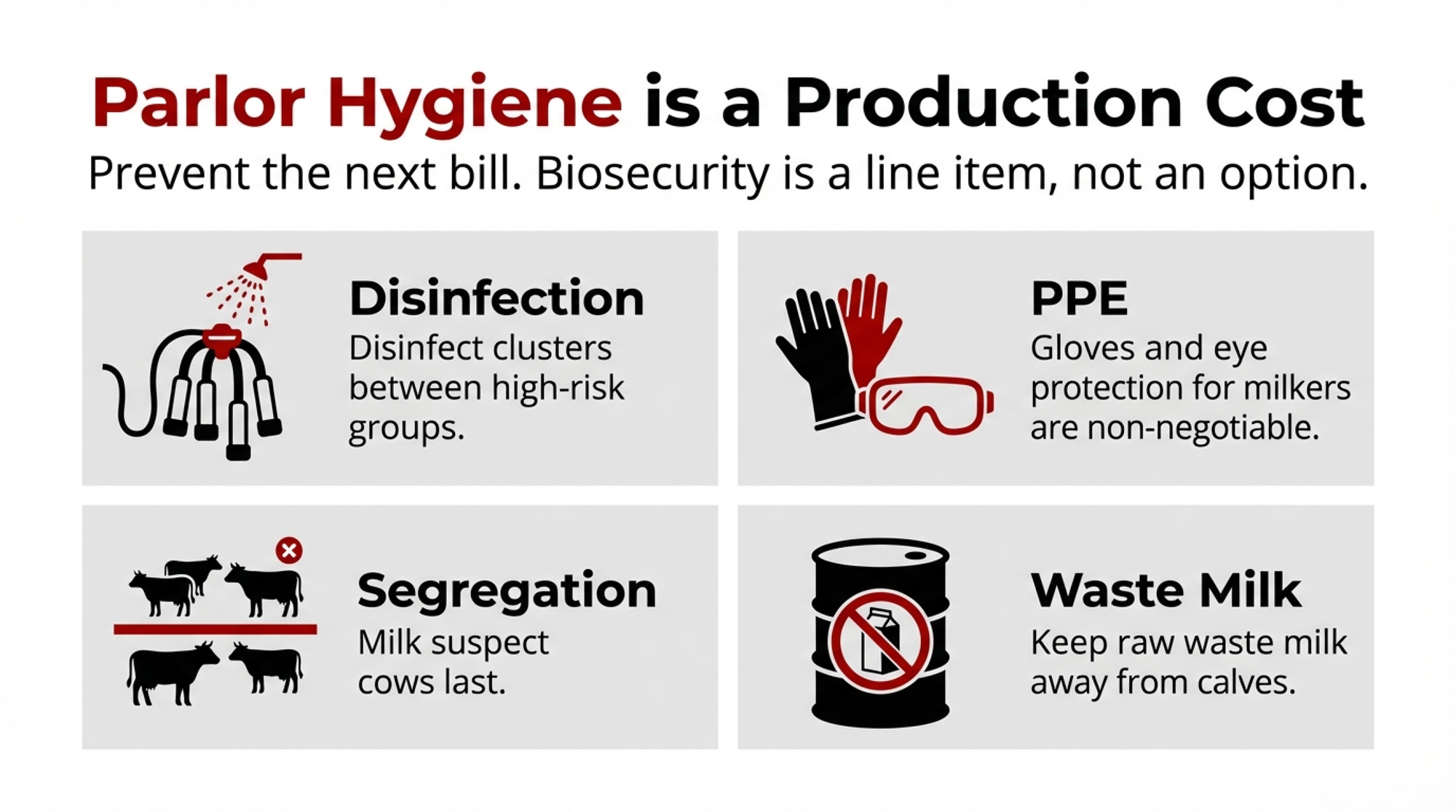 - Biosecurity and testing now pay for themselves. The alternative: another outbreak, another milk crash, another 90-day fertility bill.