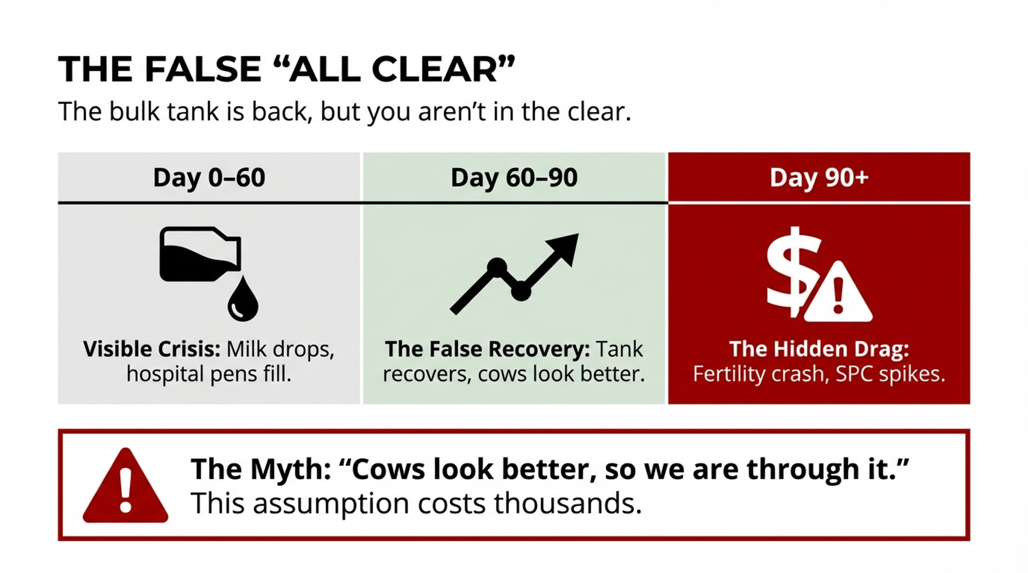 Here’s the important part: your “All Clear” isn’t when the cows look better, or the tank recovers. For practical management, it’s when your rolling SPC average for that group comes back to its 12-month baseline and holds there for a sustained period. Until that happens, you should assume you’re still paying some level of fertility cost from that earlier inflammatory hit.