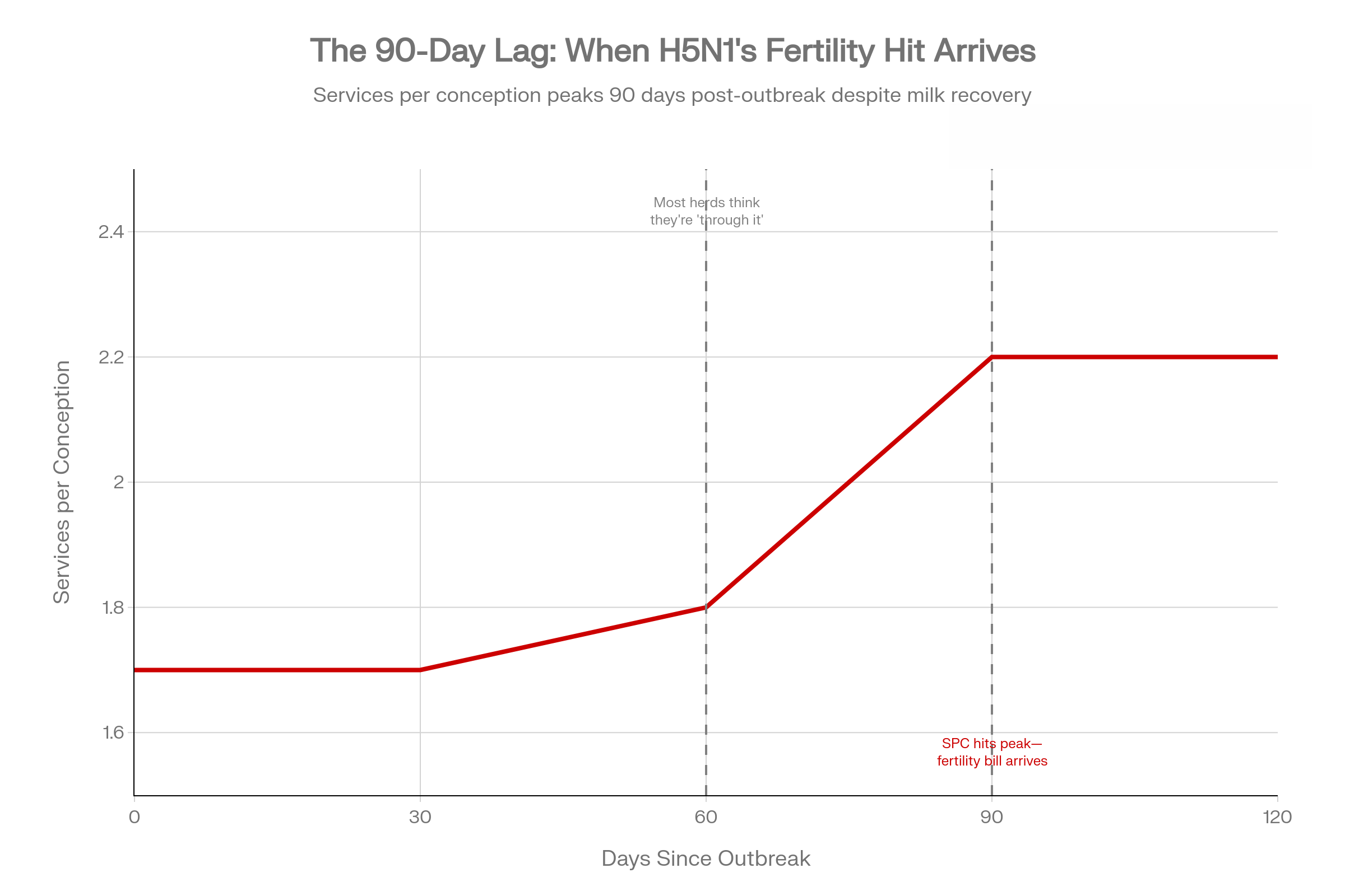 You might not be. Early U.S. herd data suggest one of the easiest costs to miss from H5N1 shows up 60–90 days later, when services per conception climb by roughly 0.3–0.5 above your own 12-month baseline and stay there. For a 1,000-cow herd, that kind of fertility drag adds up fast once you factor in extra semen, extra days open, and extra labor. The example further down walks through what that 0.5 SPC bump can mean when you plug in your own prices.