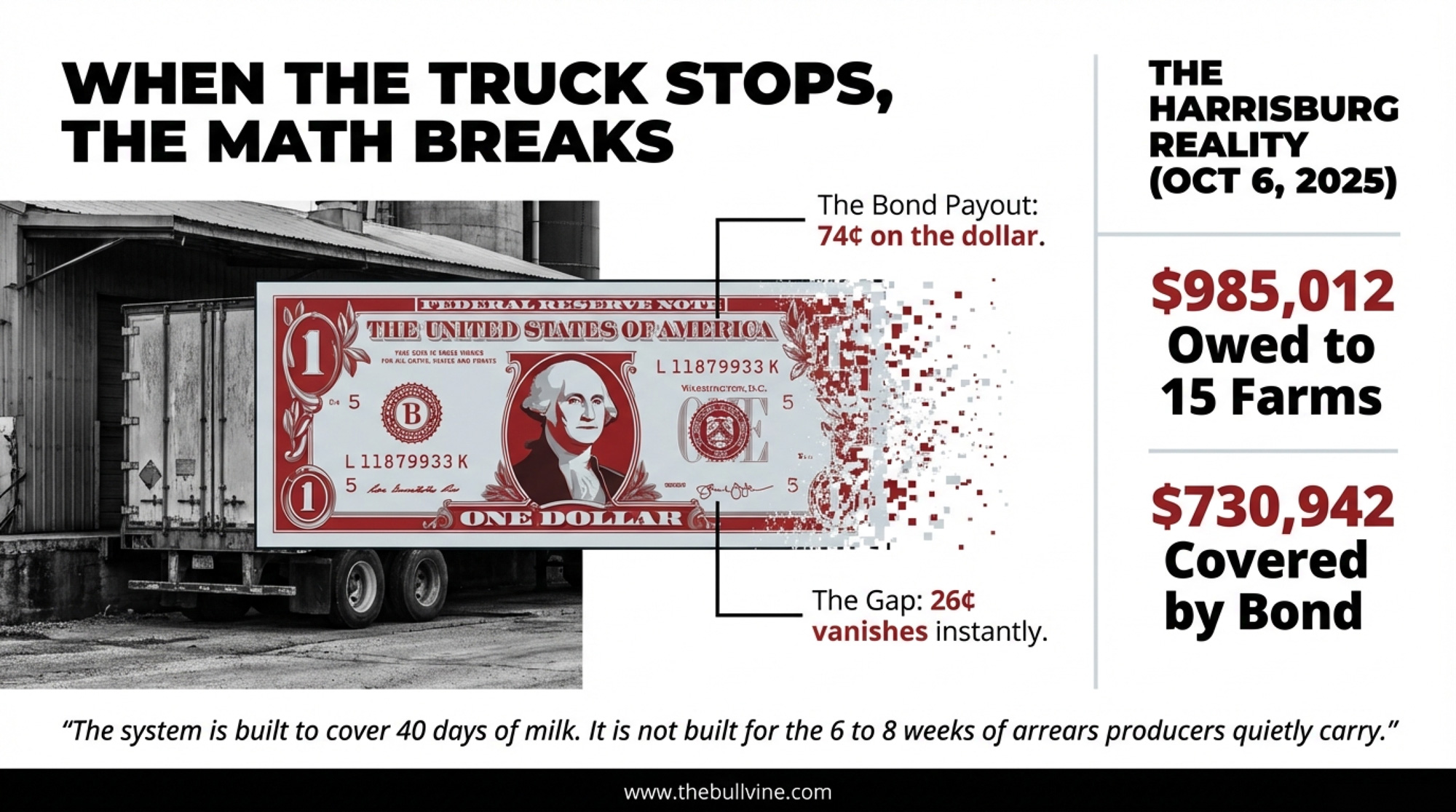 $985,012. That’s the total owed to 15 central Pennsylvania dairy farms when Harrisburg Dairies permanently ceased operations on October 6, 2025, according to Pennsylvania Milk Marketing Board executive secretary Betsy Albright in state milk board records and local coverage from October 2025. The company’s security bond and collateral covered $730,942.29 — roughly 74 cents on every dollar owed. The other 26 cents? That’s the gap the system wasn’t built to close.