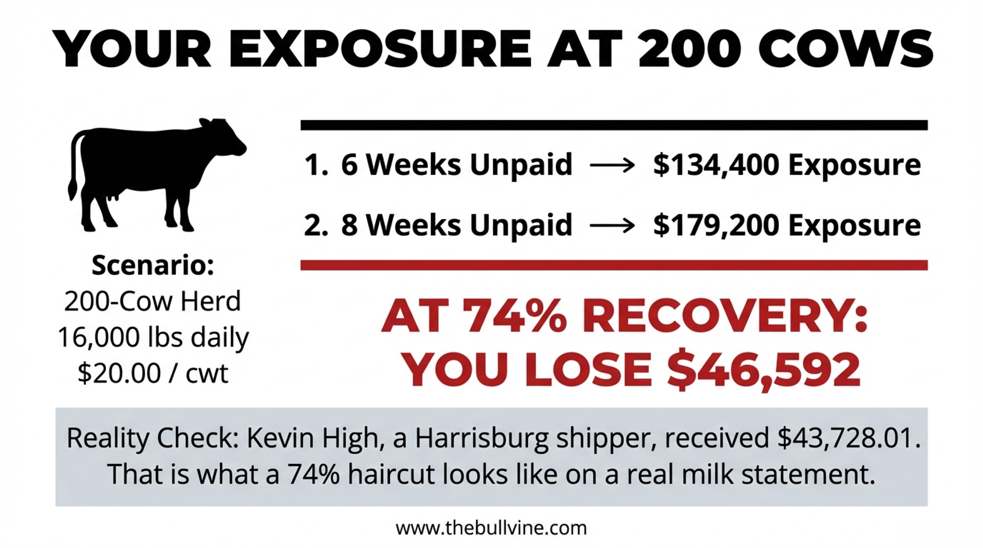 The 15 Harrisburg farms averaged roughly $65,700 each in total unpaid milk, some substantially more. At a 74% recovery rate, the average unrecovered loss per farm is around $17,000. Plug in your own herd size. At 300 cows, eight weeks at $20/cwt is $268,800. At 74% recovery, you’re absorbing nearly $70,000 in losses.