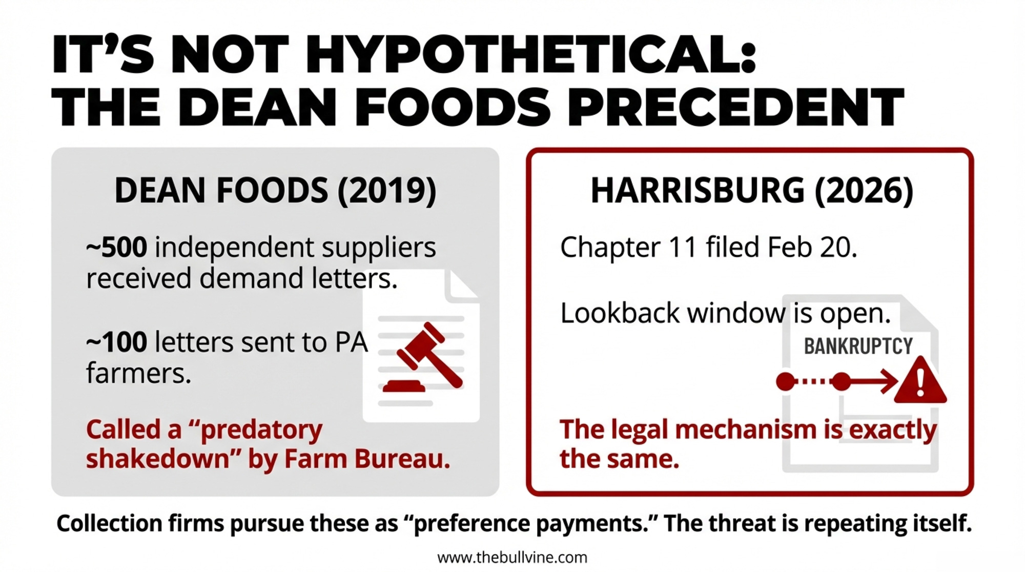 This isn’t hypothetical. When Dean Foods filed Chapter 11 in November 2019 — a collapse The Bullvine covered extensively, from the $850 million DIP financing to how two years of changes led to two major bankruptcies — approximately 500 independent former Dean milk suppliers received demand letters from ASK LLP, a St. Paul, Minnesota firm authorized to pursue preference actions as of September 1, 2020. About 100 of those letters went to Pennsylvania dairy farmers alone. AFBF called the letters “a predatory shakedown,” and General Counsel Ellen Steen demanded ASK withdraw them within 10 business days.