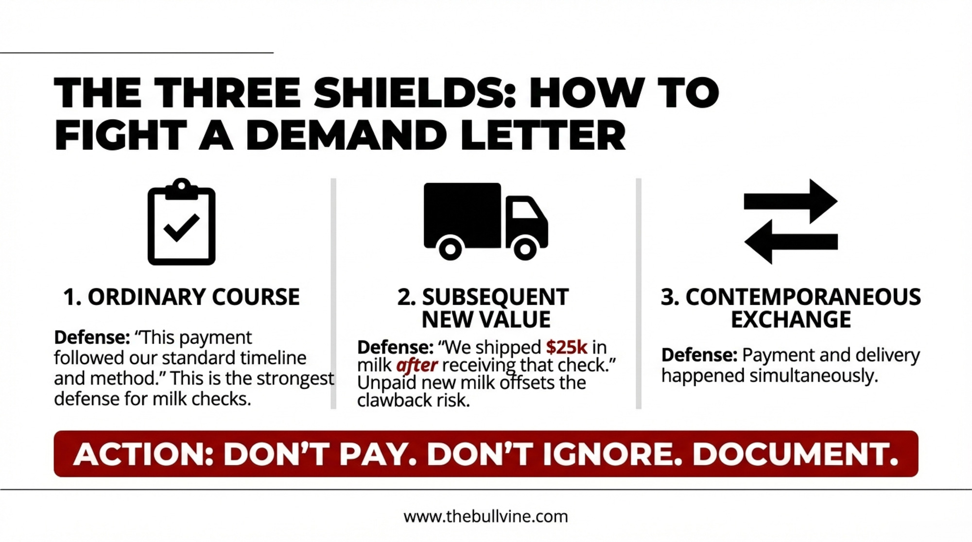 - Ordinary course of business: If that December check looks like how you’d always been paid — same lag, same method — courts often side with you. For milk, where everyone knows standard pay cycles, this defense is strong.