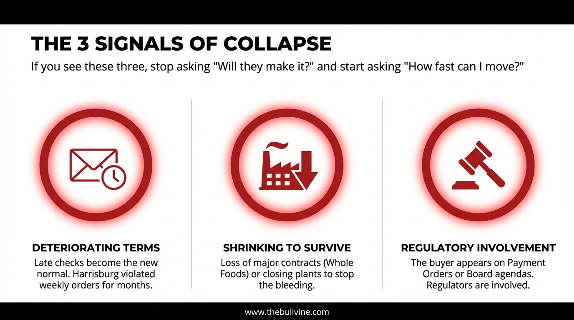 - Regulators become characters in the story. Payment orders, missed pool payments, PMB hearings, and special oversight. Borden needed court permission to pay the December 2019 milk bills. When your buyer’s name starts appearing regularly on regulatory hearing agendas, treat it as a serious risk signal — not a guarantee of failure, but a pattern that preceded every processor collapse examined here.