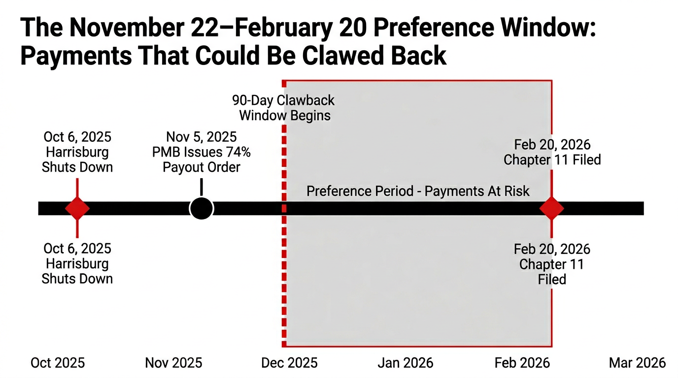 Harrisburg’s 90-day window reaches back to approximately November 22, 2025. Any partial payments clearing old balances during that window could be subject to clawback demands — from farms that were already underwater.
