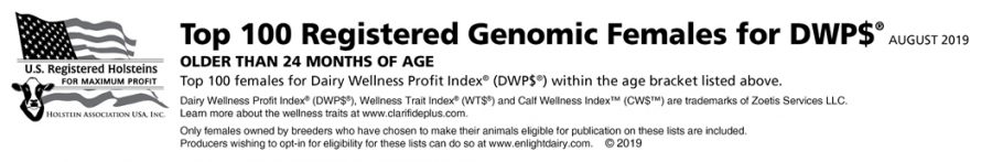 | Registration Number | Name | Date of Birth | Sire's Name | PTAP | PTAP% | PTAF | PTAF% | Milk | Milk Rel. | SCS | PL | Liv | DPR | UDC | FLC | BWC | DSB | Mast Rel | WT$ | CW$ | DWP$ |
