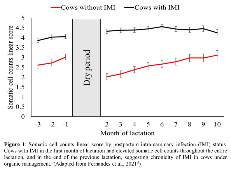 disease. Some strategies to control IMI such as drying off affected quarters, homeopathy, and botanical products are used by organic producers, but there is a lack of evidence on Figure 1: Somatic cell counts linear score by postpartum intramammary infection (IMI) status. Cows with IMI in the first month of lactation had elevated somatic cell counts throughout the entire lactation, and in the end of the previous lactation, suggesting chronicity of IMI in cows under organic management. (Adapted from Fernandes et al., 20215 ) the effectiveness of these strategies6 . Further research is needed to help organic producers find new and efficient tools to prevent and treat mastitis that are alternative to antibiotics.