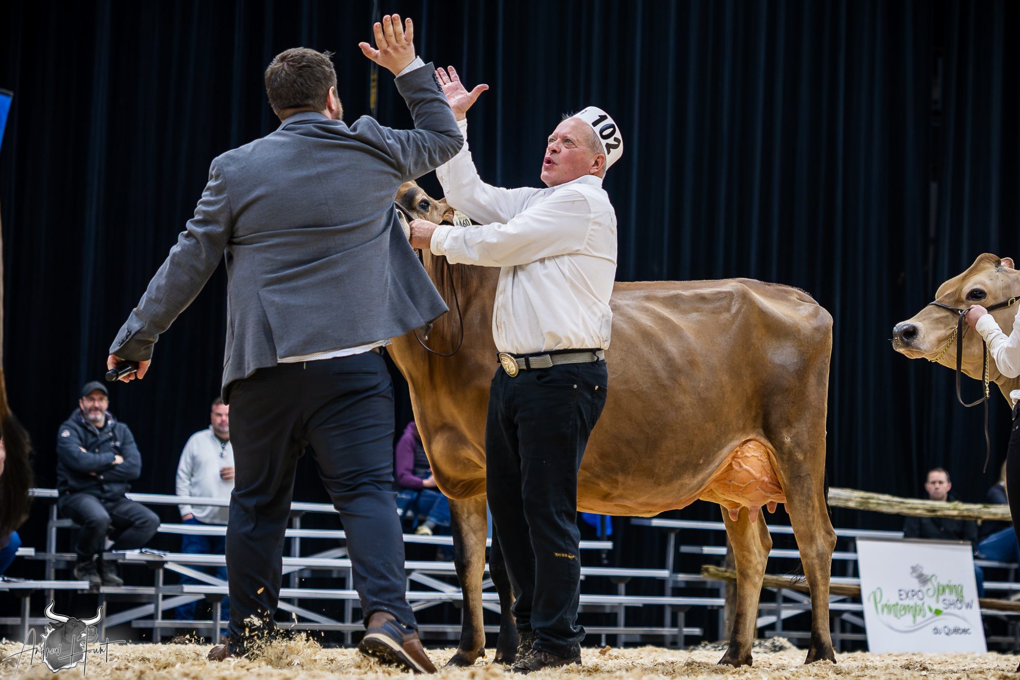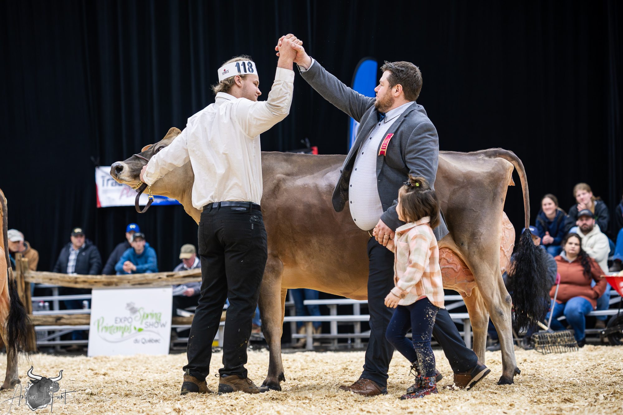 JP Charest closed the day the way he opened it — by thanking exhibitors, his wife Maryse for serving as his ring steward, his kids Louis and Juliette ringside, his family and uncle holding the fort, and the Expo Printemps committee. Then he summed the day up cleanly: “We got five exceptional cows that exemplified the Jersey breed, and how strong it is in Quebec.”