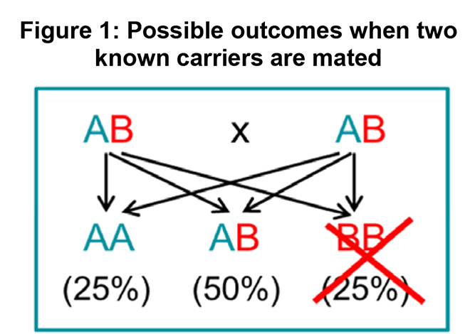 Figure 1 illustrates the possible outcomes when two known carriers are mated together. Using HCD as an example, in this situation, 25% of offspring will be homozygous dominant (AA) and unaffected, 50% will be heterozygous (AB) and unaffected but able to pass on the recessive gene, while another 25% will be homozygous recessive (BB) and die, likely before weaning.