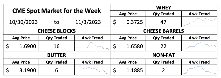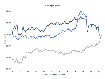 Churns ran a little harder in September. Butter output climbed to 144.6 million pounds, up 2.9% from September 2022. Cream prices dropped in October, and anecdotal reports suggest that butter output grew once again last month. Spot butter took another large step on the long road to post-holiday values. It plummeted 8.5ȼ to $3.1075. So far, the earlyNovember decline in butter pricing is not as breathtaking as last year’s cliff jump. But there is more work to be done.