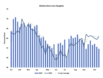Class IV futures are adequate to pay the bills, but most producers receive at least some Class III revenue as well. The milk markets are offering much better returns than they did this summer, but they’re still not likely to bring widespread prosperity. Nonetheless, there are indications that milk production is improving. Cooler temperatures are boosting milk output and components. Slaughter volumes have been running light for at least seven straight weeks. Some of the slowdown in cull rates can be dismissed as the inevitable consequence of aggressive culling this summer, which left fewer low-production or ailing cows to be killed this fall. And tight heifer supplies are forcing some dairy producers to rein in cull rates just to retain their head counts. But there is no denying that slaughter volumes have been lower than expected for longer than expected, hinting at growth – or at least stabilization – in the milk-cow herd.