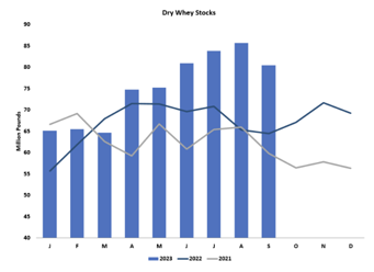 Whey powder output also fell short of year-ago volumes in September, albeit by a narrow margin. Still, a deficit is a deficit and it’s nice to see a shift after five months of formidable output. Whey processors