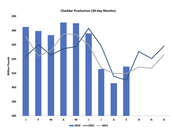 On the other side of the world, New Zealand milk output technically fell short of year-ago volumes in September, with fluid milk collections down 0.4% from September 2022. But milk solids output jumped 1.3% year over year, flipping season-to-date milk solids collections into the black. Kiwi producers are frustrated with high interest rates and relatively low pay prices, and they may face a difficult summer due to El Niño. However, they’re coasting through the seasonal peak in relatively good condition.