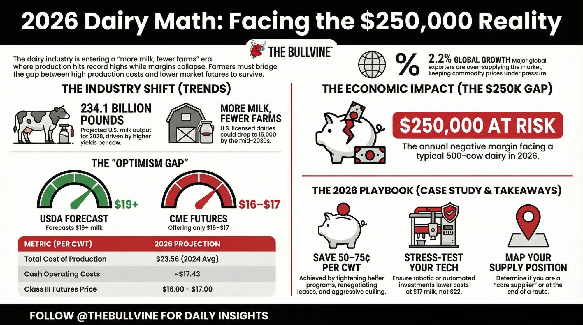 Executive Summary: For 2026, the core math is brutal: many 500‑cow dairies face up to a $250,000 annual margin gap between their full cost of production and what 2026 Class III futures will actually pay. USDA projects U.S. milk output climbing to about 231.4 billion pounds in 2025 and 234.1 billion pounds in 2026, even as licensed dairy herds keep dropping, confirming we’re in a “more milk, fewer farms” era, not a supply crunch. Rabobank’s Q4 Big‑7 analysis shows global exporters finished 2025 around 2.2 percent ahead of 2024 on a milk‑solids basis, so the world is long on milk and short on comfortable margins. Using farmdoc’s detailed cost work, the article walks through how full costs in the low‑$20s per hundredweight collide with $16–17 futures and what that means in dollars per farm, not just theory. A 600‑cow Wisconsin case study then illustrates how tightening heifer programs, sharpening culling, and revisiting land and lease costs can pull breakeven closer to realistic price levels. The piece closes with a concrete 2026 playbook—know your true cost, map your position in your processor’s supply network, stress‑test technology and expansion plans, and decide whether to grow, hold, or exit before the market decides for you.