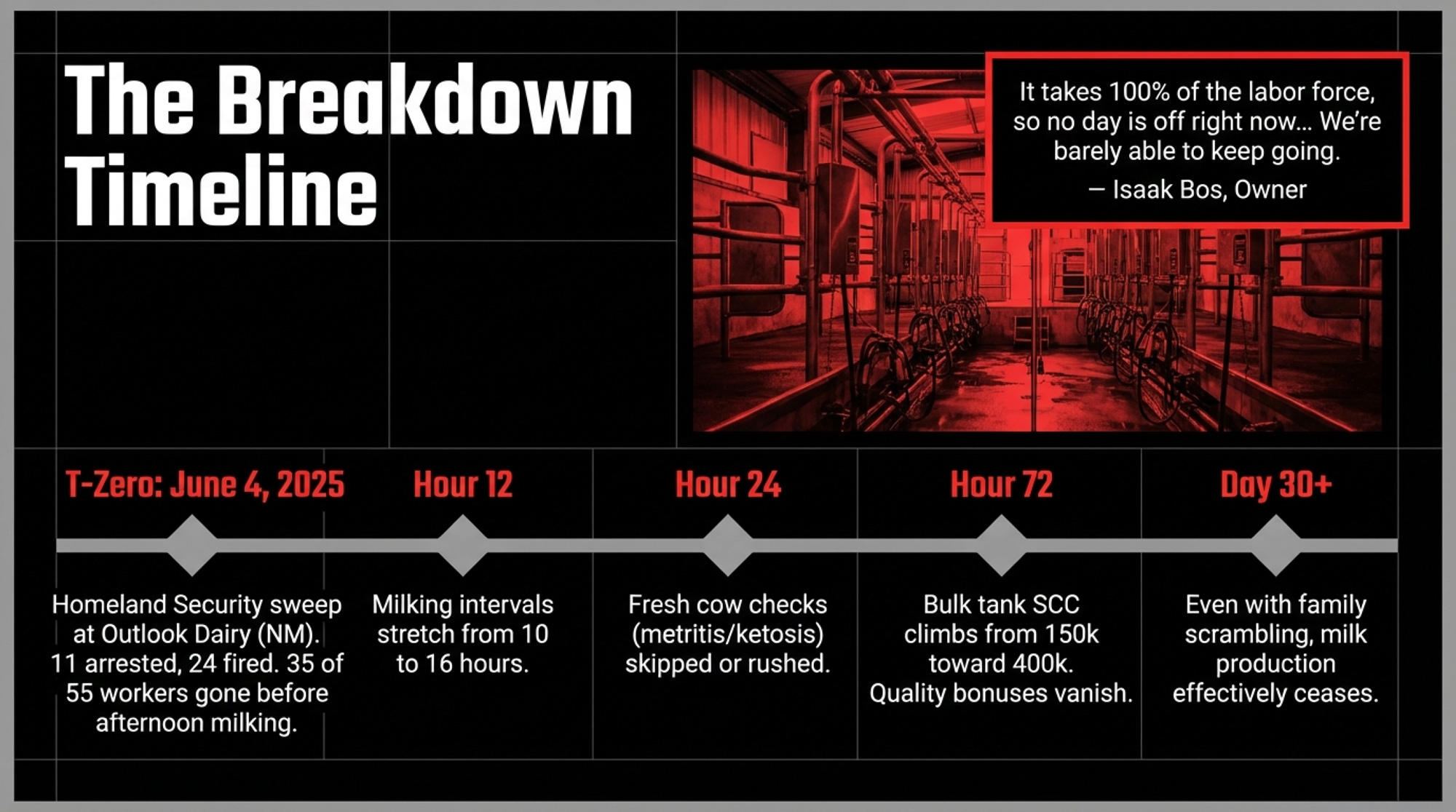 Now imagine a disruption like Outlook’s. It doesn’t have to be ICE. Two experienced milkers get into a car accident.. A family emergency in a three‑person crew. Or enforcement activity one county over that sends half your workforce home to pack a bag.