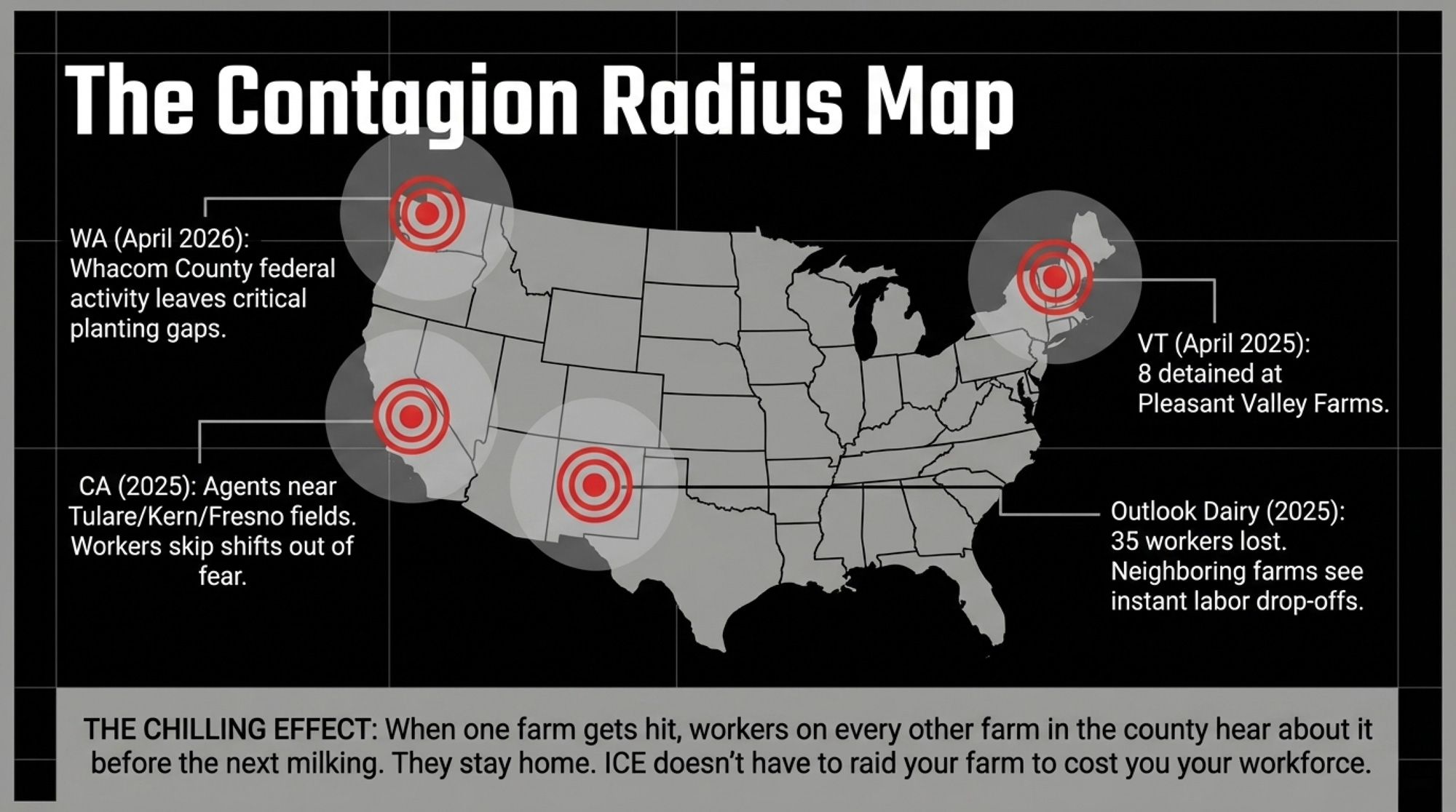 By April 2026, a Whatcom County, Washington producer told local TV that federal activity in the area was leaving critical gaps during planting season. He wouldn’t allow his name to be used for fear of making things worse for his workers.