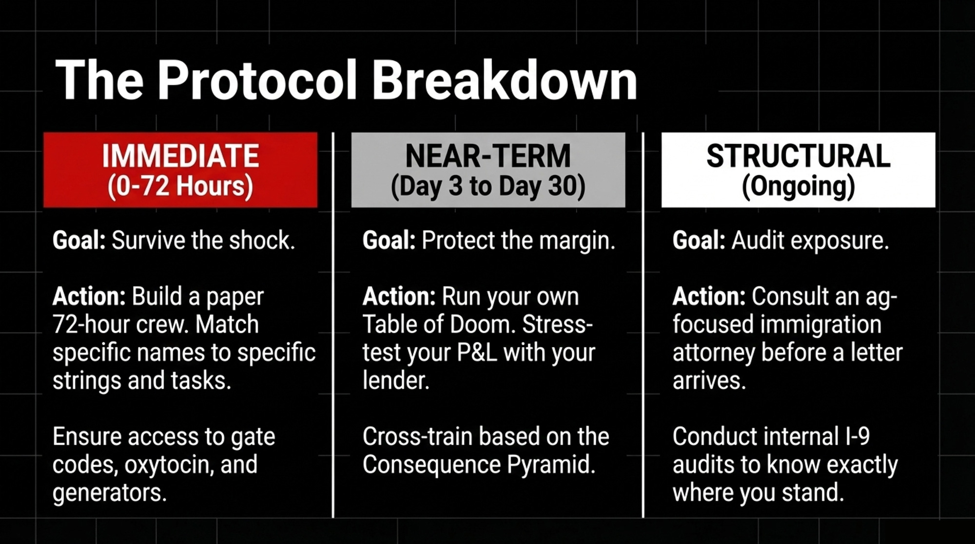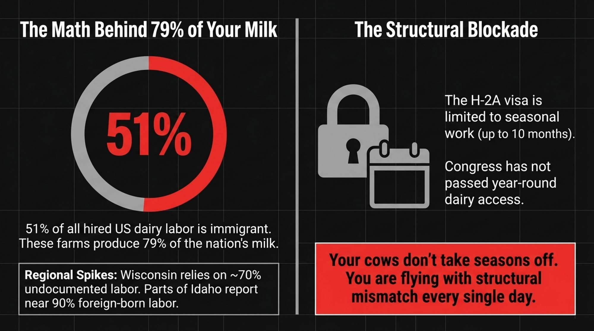 Executive Summary: Outlook Dairy in New Mexico lost 35 of 55 workers before afternoon milking in a single enforcement action, and milk production “effectively ceased” overnight. The article shows how that kind of hit translates into a 30‑day loss of roughly $25,620 in milk from a 10 lb/cow/day drop on 400 cows, plus another ~$17,000 in quality penalties, emergency wages, and repro/vet lag. It explains why 51% of U.S. hired dairy labor and 79% of the milk now depend on immigrant workers, with states like Wisconsin at ~70% undocumented labor and parts of Idaho near 90%. You’ll see why H‑2A still doesn’t fit year‑round dairying, what happens when enforcement touches your county (including the “chilling effect” on neighboring farms), and why robots are a long‑payback strategy, not an emergency exit. Then it walks you through a simple 30‑day “Table of Doom” you can run on your own herd and a 72‑hour backup‑crew checklist that forces you to answer who actually shows up if three key people don’t. If you’ve never put hard numbers on a labor shock for your own cows — or asked your lender to stress‑test one — this is worth ten minutes and a notepad.