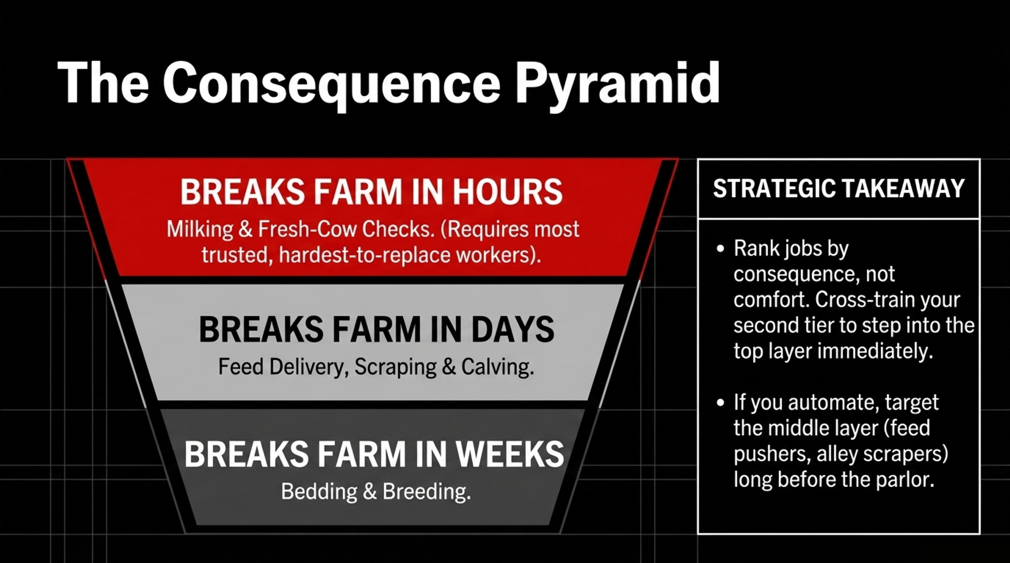 First question: on your farm, which jobs break things the fastest if they don’t get done for 24–72 hours? Milking is obvious. Fresh‑cow checks, calvings, and feed delivery aren’t far behind. Scraping, bedding, and breeding probably slot in after that.
