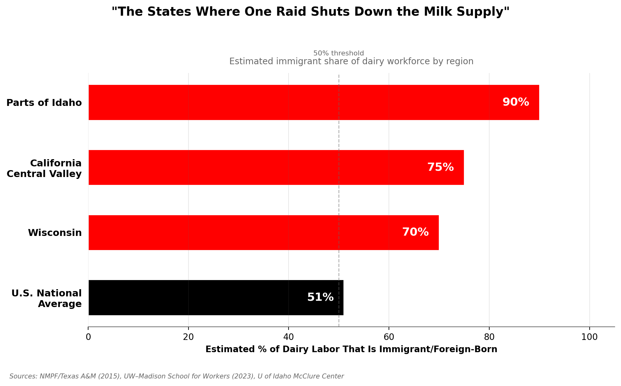 The dependency hasn’t shrunk since 2015. A 2023 UW–Madison School for Workers survey estimated that more than 10,000 undocumented workers perform about 70% of Wisconsin’s dairy labor, and the authors warned that without them, the state’s dairy industry “would collapse overnight.” In parts of Idaho, the University of Idaho’s McClure Center has documented dairies where roughly 9 out of 10 workers are foreign‑born.