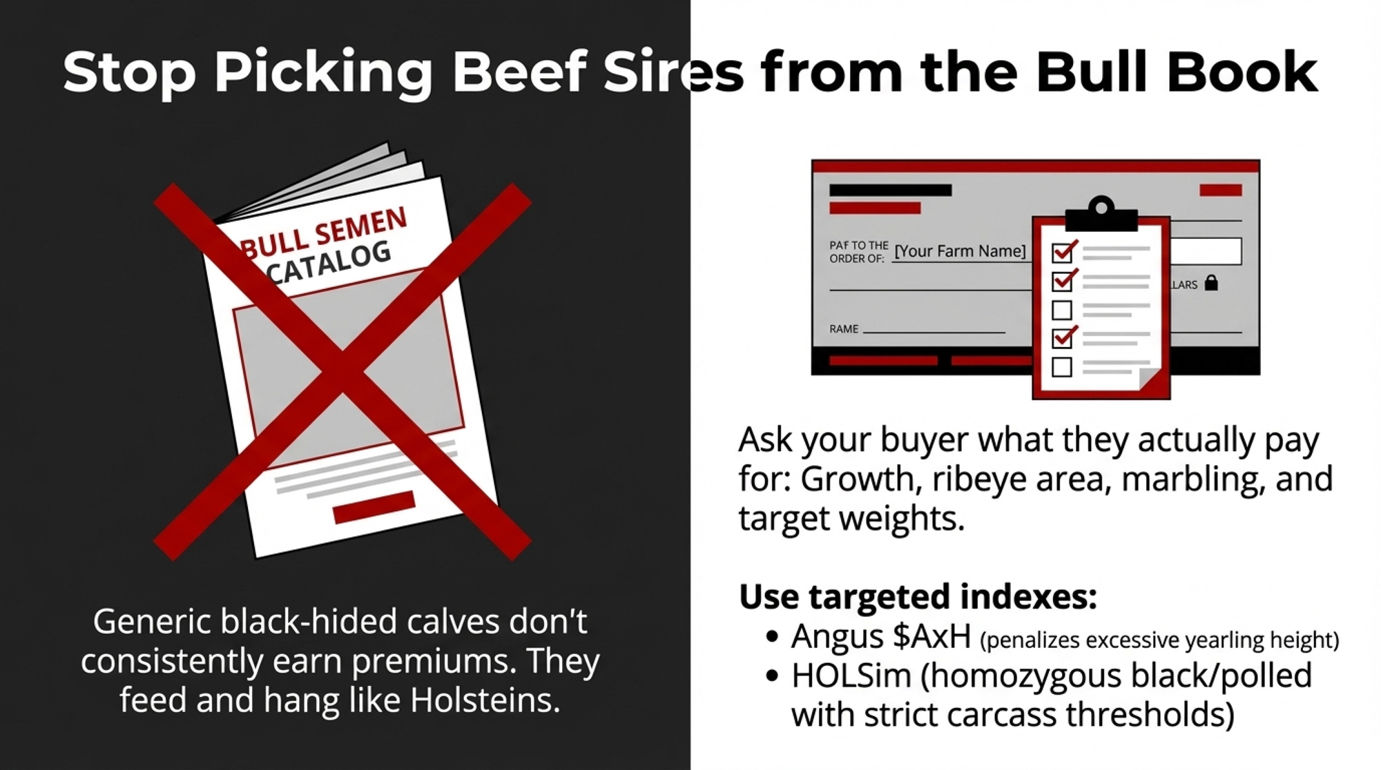 - Sit down with your calf buyer or integrator before your next semen order and get their specs in writing: breed, color, horn status, target weight, and how they pay. Build your beef sire list backward from that conversation using $AxH or HOLSim bulls that fit, instead of forward from whichever bull picture looks best in the catalog.