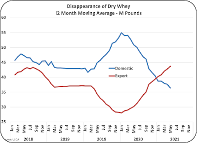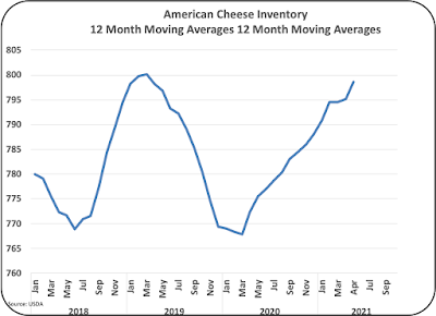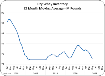 In January of 2019, when inventories levels were near the current levels, the price of cheese as published by AMS was $1.54 per pound. In May 2021 inventories are nearly the same, but the AMS price of cheese is $1.82 per pound. It is no wonder that in June, the AMS price of cheese dropped to $1.64 per pound. Currently, the NASS weekly survey numbers for cheese are falling to a level near $1.50 per pound.