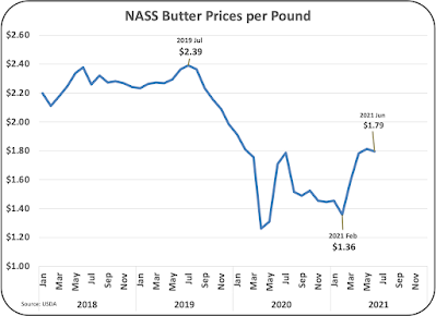With the increase in butter inventories, the price of butter has fallen from the 2018 and 2019 record levels of $2.39 per pound. In February 2021, butter prices were at $1.36 per pound. In the last three months there has been increases in butter prices with June at $1.79 per pound. The most recent weekly AMS prices have remained at the June 2021 levels. But with rising inventories, prices will likely begin to fall in the near future.