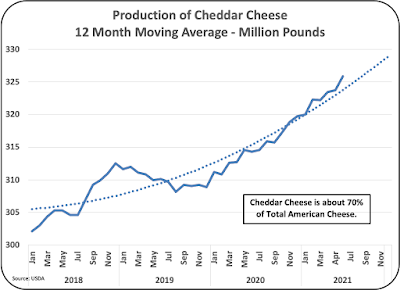 The price of cheese, as determined by Agricultural Marketing Service (AMS), is based on the price paid for young (up to 30 days old) Cheddar cheese. The monthly production of Cheddar cheese is public, and the current 12-month averages and trends are shown in Chart II. In May 2020, one year ago, the 12-month moving average increase in production of Cheddar vs. the prior year was .3 percent. In May of 2021, the most recent data, the 12-month moving average increase is three percent.