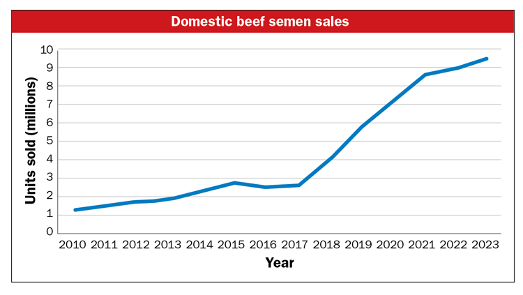 Just think of it, a whopping 9.4 million units of beef semen were sold in the United States during 2023. That’s an impressive uplift of 4.6% from the prior year, keeping us on a six-year streak of record-breaking sales. The grand leap in this cycle occurred back in 2018 when sales skyrocketed by 58%.