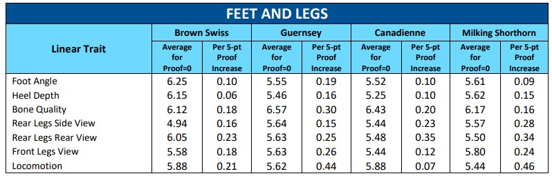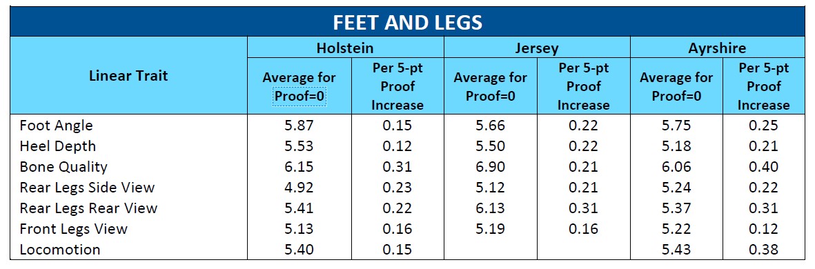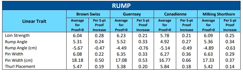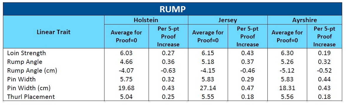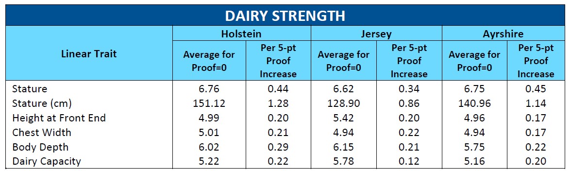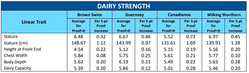 - “Average for Proof=0” column is the calculated average linear score of daughters in first lactation for a sire with a proof of zero (the average bull for the breed)