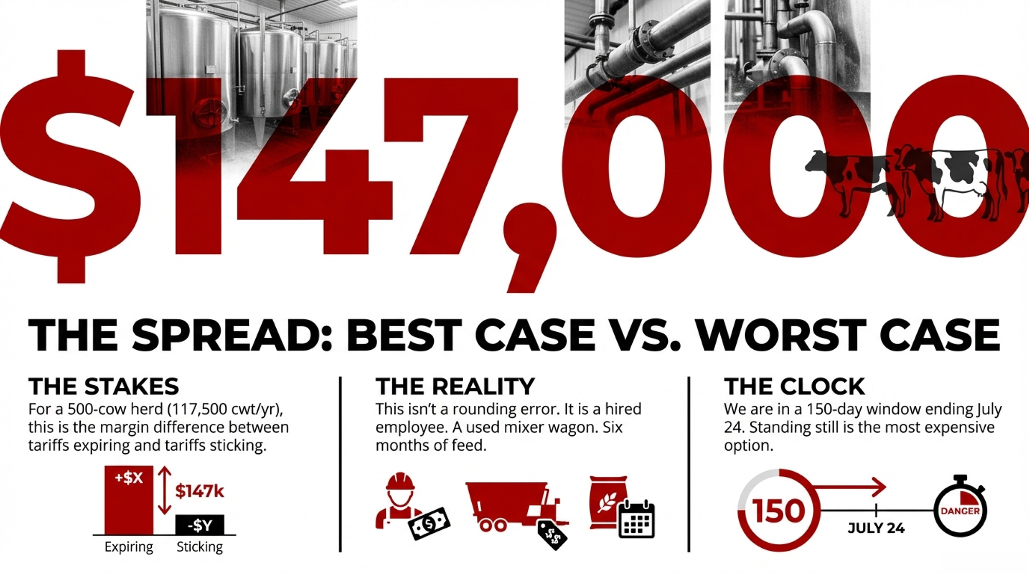 - On a 500‑cow, 117,500‑cwt herd, the gap between tariffs gone, a 15% replacement, or ongoing limbo is roughly $147,000 in annual margin.