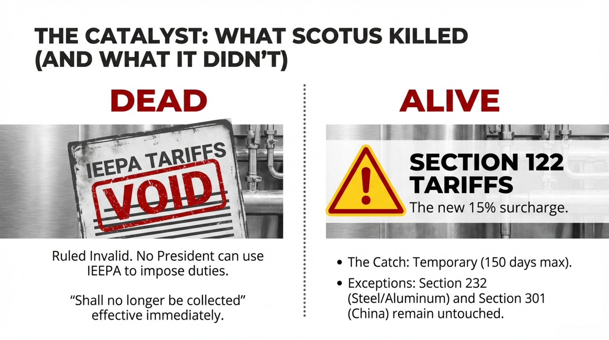 What’s still standing: Section 232 tariffs (national security — steel, aluminum), Section 301 tariffs (unfair trade practices — existing China tariffs on specific goods), and antidumping/countervailing duties. These operate under separate statutory authority and weren’t touched by the ruling.