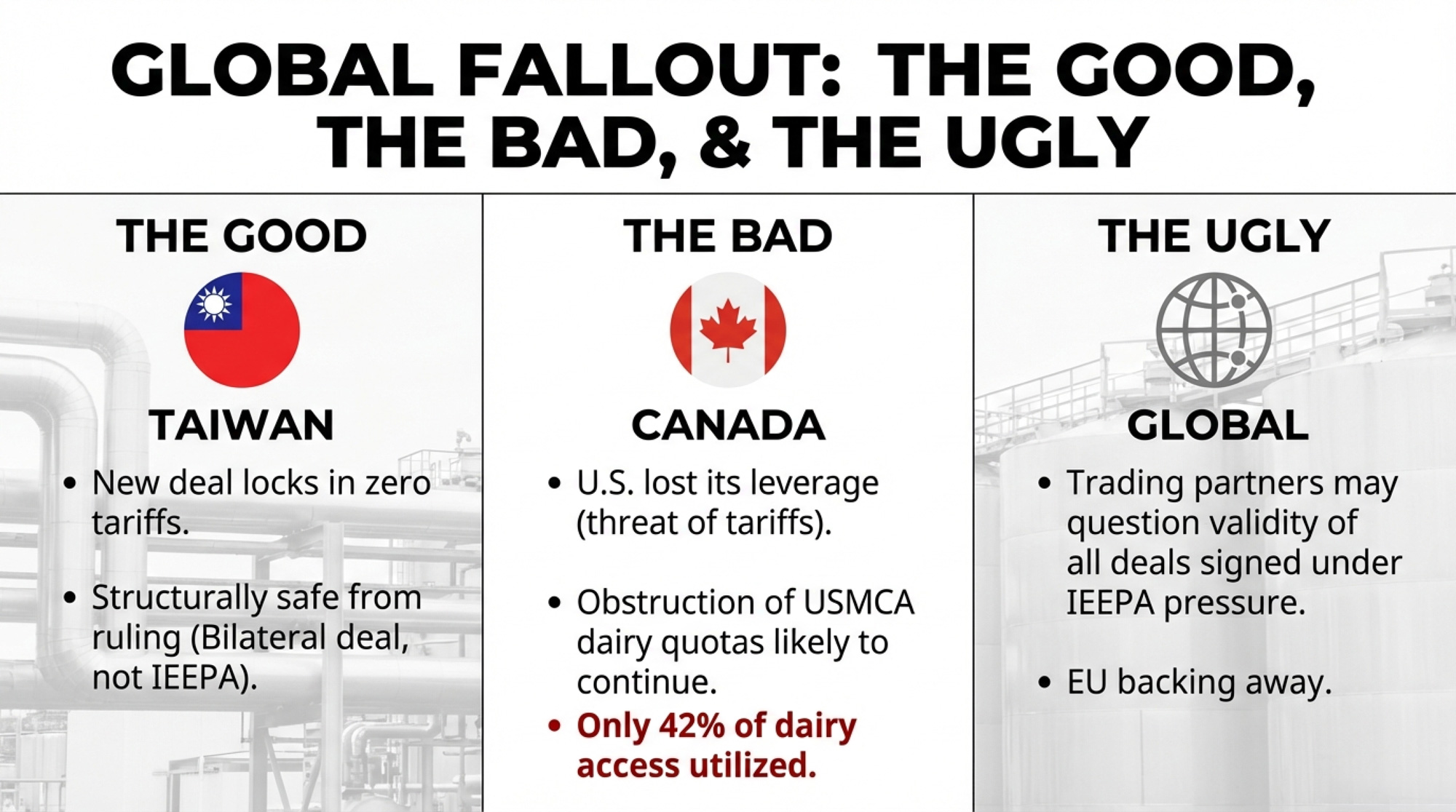 - Taiwan is now a zero‑tariff bright spot, but Canada’s USMCA TRQ games just got new cover, leaving as much as 58% of U.S. dairy access to Canada stranded on paper.