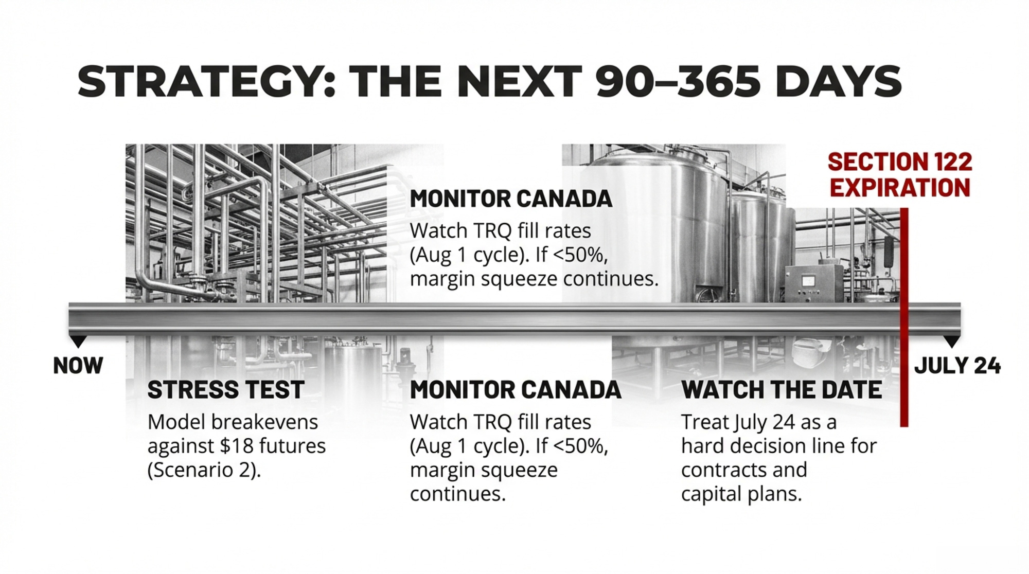| Next 365 Days (Now – Feb 2027) | Strategic repositioning | Track Canada TRQ fill rates (Aug 1 allocation); monitor Section 301 investigations | $147K margin spread crystallizes without plan | Canada TRQ utilization: 42% (still stranded) |